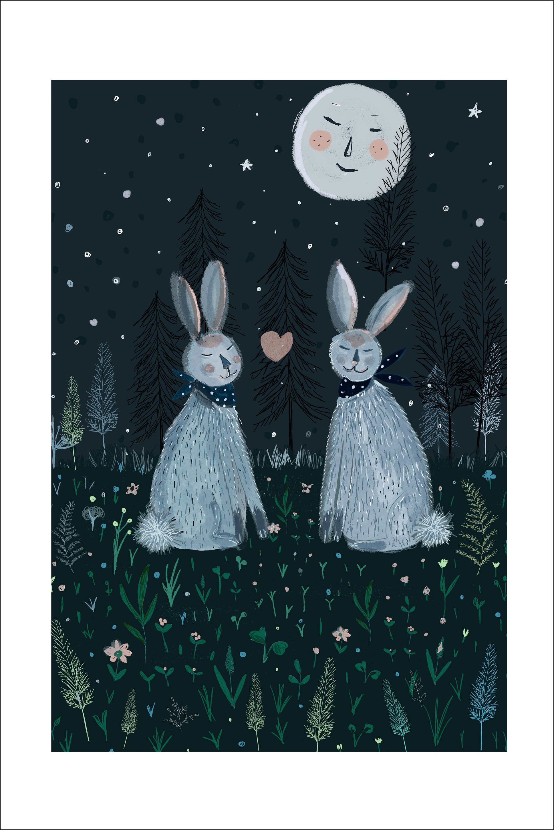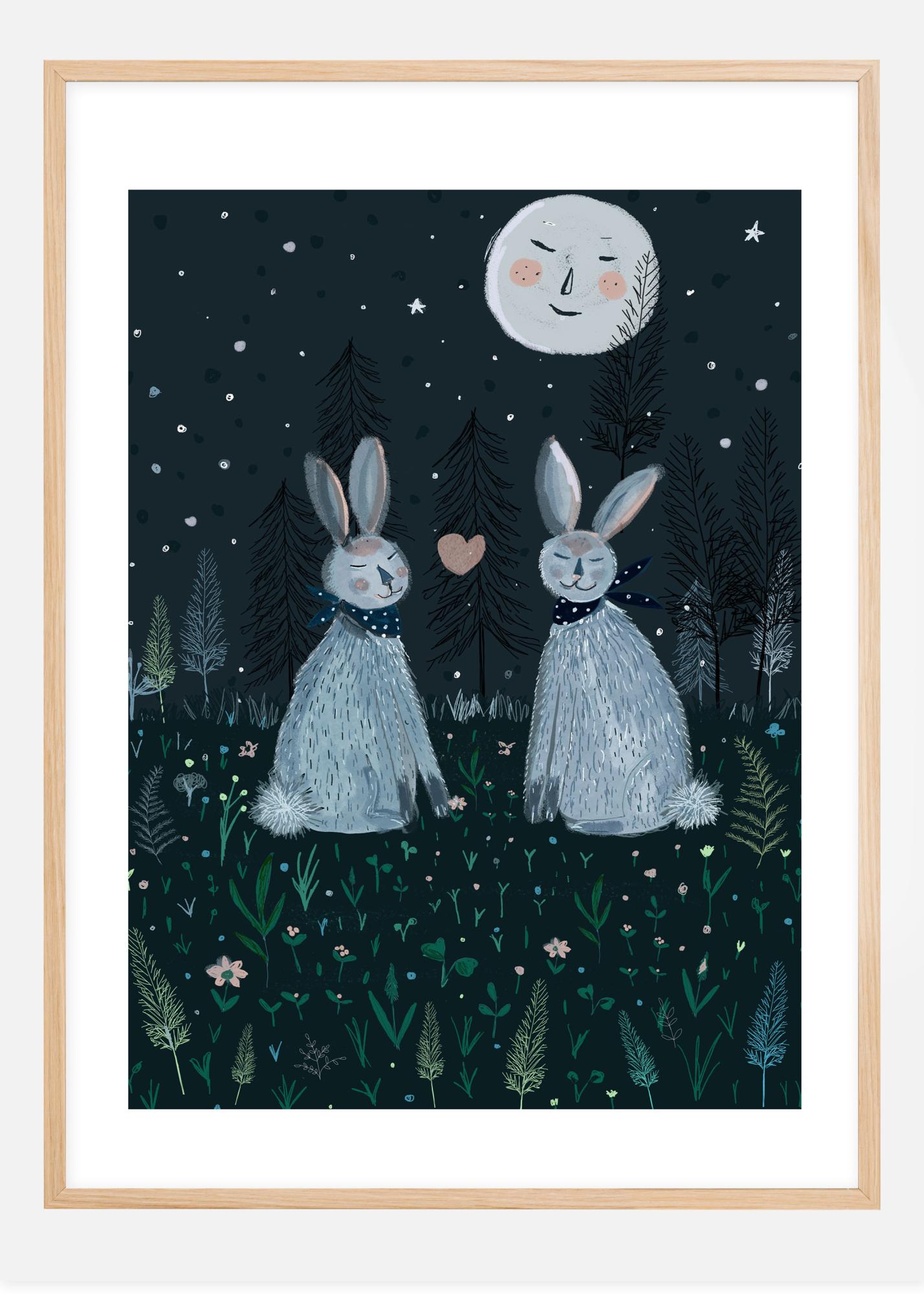 Zábavný plakát s měsícem a lesními králíky, kteří spí hlubokým spánkem. Hvězdy jasně září, zatímco zemní rostliny stojí kolem v chladné večerní atmosféře. Se šátky uvázanými kolem krků králíků a srdcem umístěným mezi nimi je to ideální tisk pro všechny, kteří jsou zamilovaní.