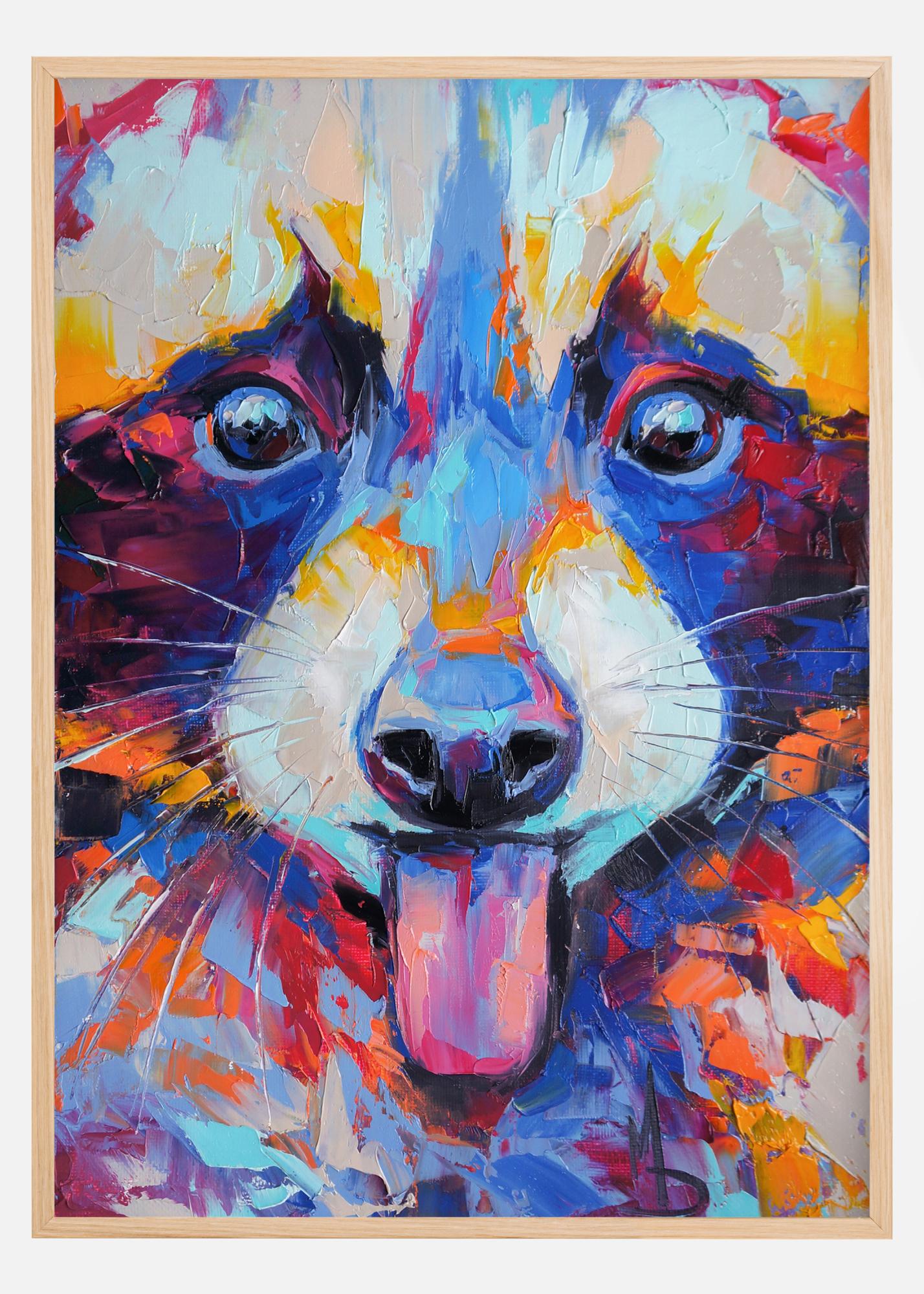 Vícebarevný portrétní plakát medvídka mývala. Dobře smíšené barvy dodávají dokonalý obraz jeho nebesky modrých očí, tmavého nosu, růžového jazyka a černobílých vousů. Přiblížený obrázek s podpisem umělce vlevo dole se nejlépe hodí do obývacího pokoje nebo ložnice milovníka zvířat.