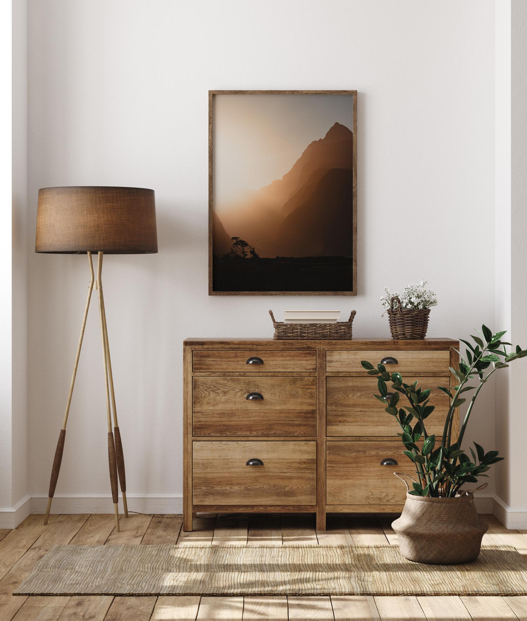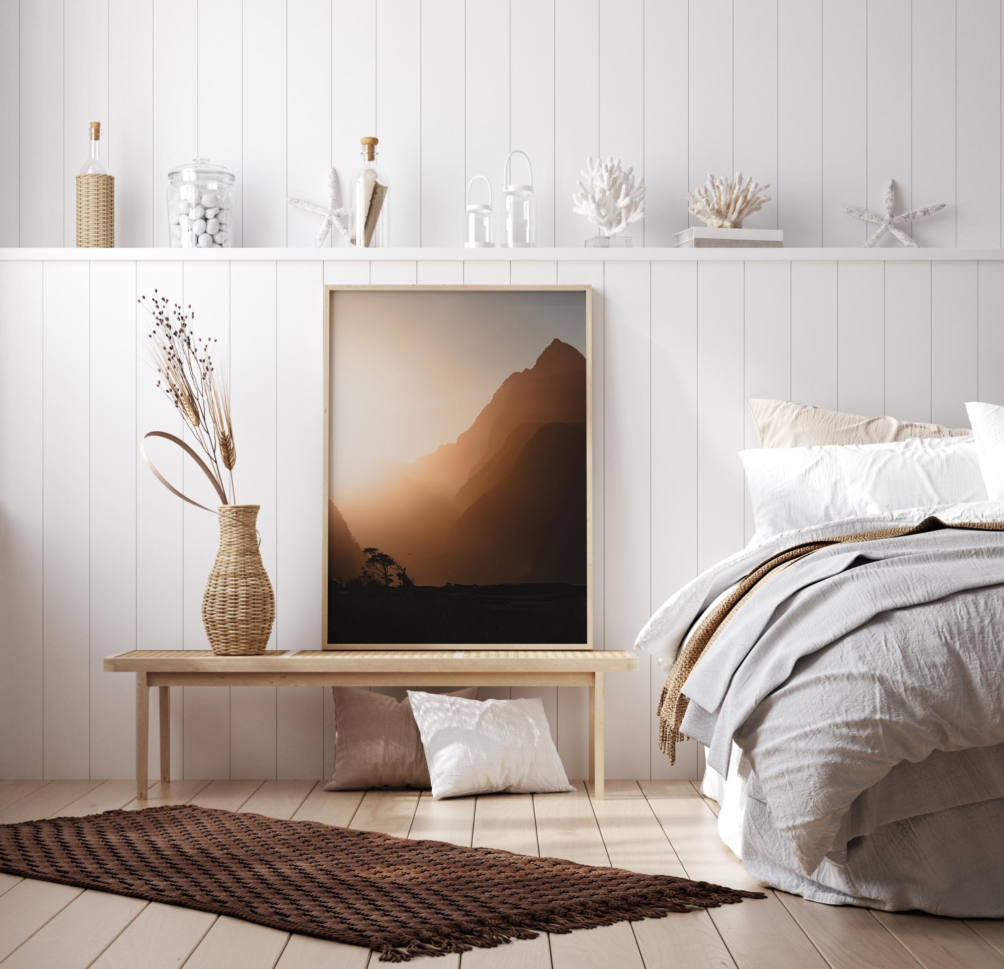 Krásný, přírodní plakát s krajinou při západu slunce. Mezera mezi kopci září jasnými oslnivými paprsky a vytváří tmavé popředí. Vzdálené stromy a pták ztělesňují existenci života. Ozdobte svou ložnici tímto živým obrazem.