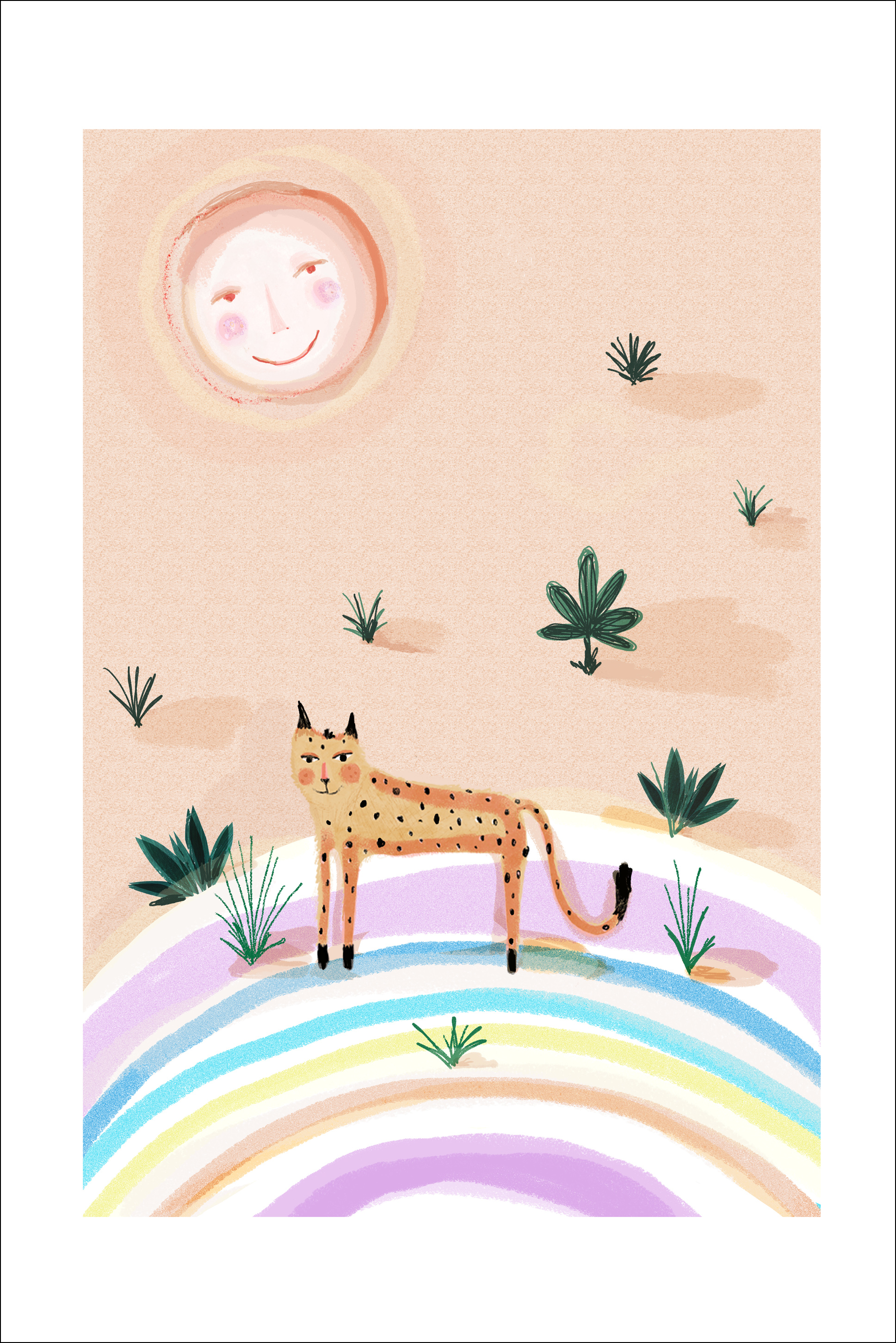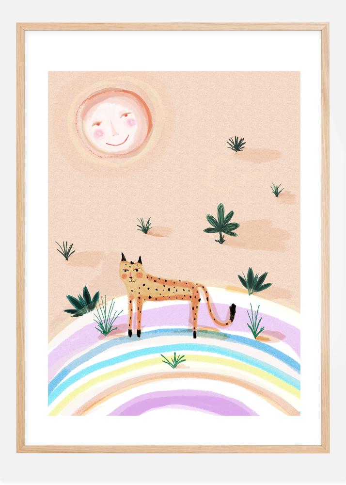 Vtipný pouštní plakát s leopardem a sluncem, které se oba usmívají. Umístěn na vícebarevném pozadí, malý tenký leopard je obklopen malými pouštními rostlinami. Ideální tisk k zavěšení do dětského pokoje pro vytvoření veselé atmosféry.