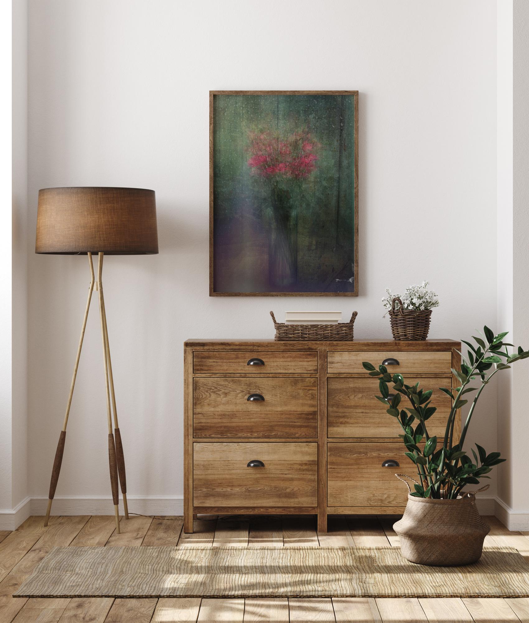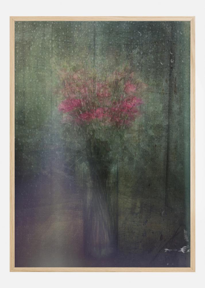 Nádherný plakát s růžovou kyticí v deštivém dni. Na zeleném pozadí stojí průhledná květinová váza na světle fialovém povrchu. Přirozené světlo svítí na květinové stonky. Ideální tisk pro stěnu v obývacím pokoji.