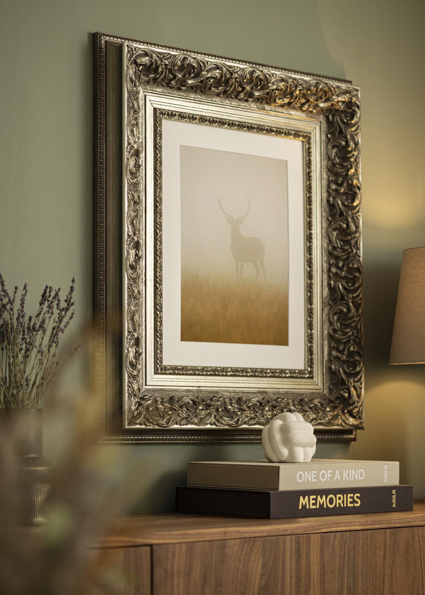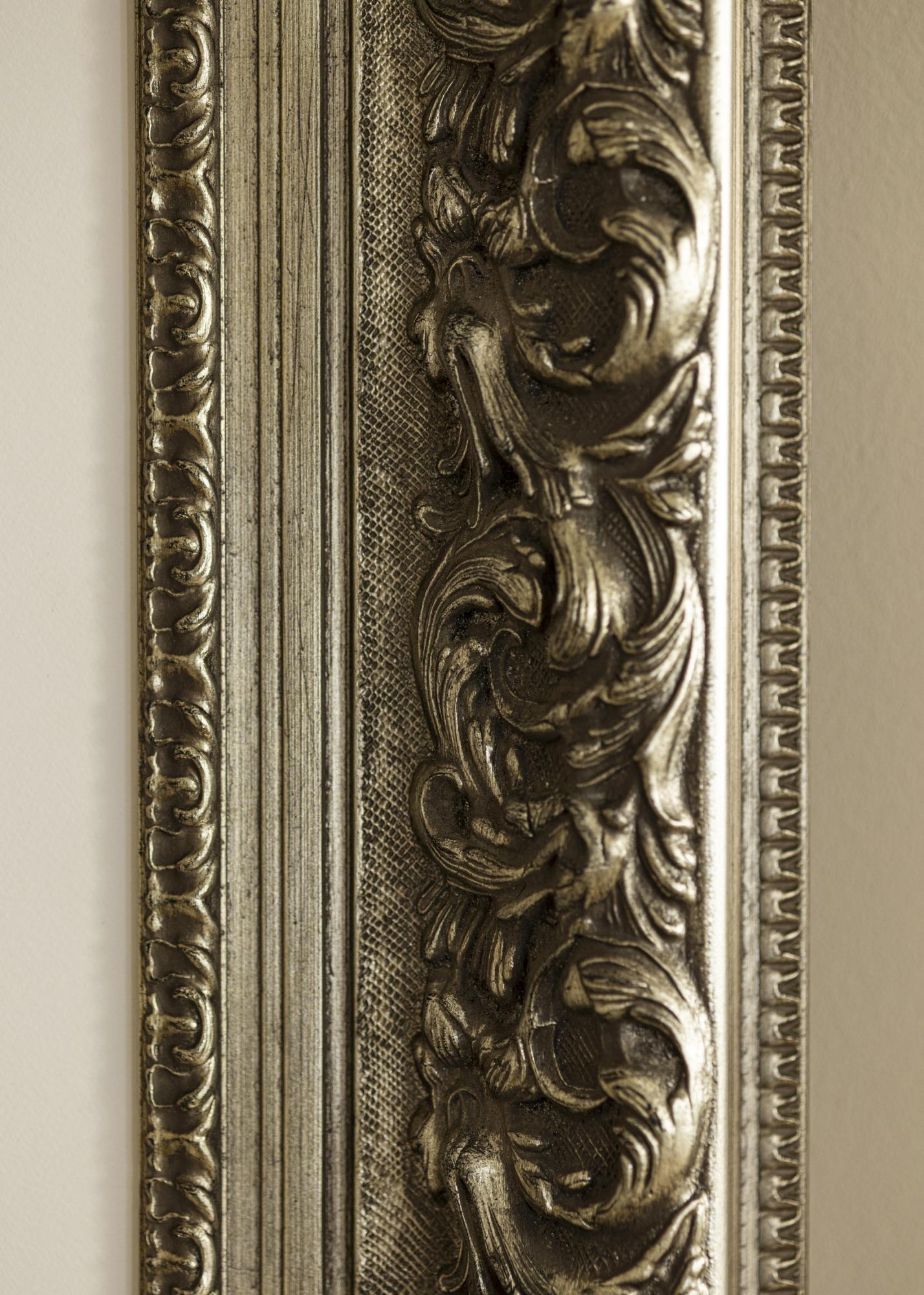 Tento bohatě zdobený rám v antickém stříbře má složité detaily a krásnou patinu, která dodává pocit elegance a nadčasovosti. Hluboký reliéf zvýrazňuje skulpturální listové vzory, což z něj činí ideální volbu pro klasické motivy a rámování, které vyžadují výrazný a dekorativní fotorám.