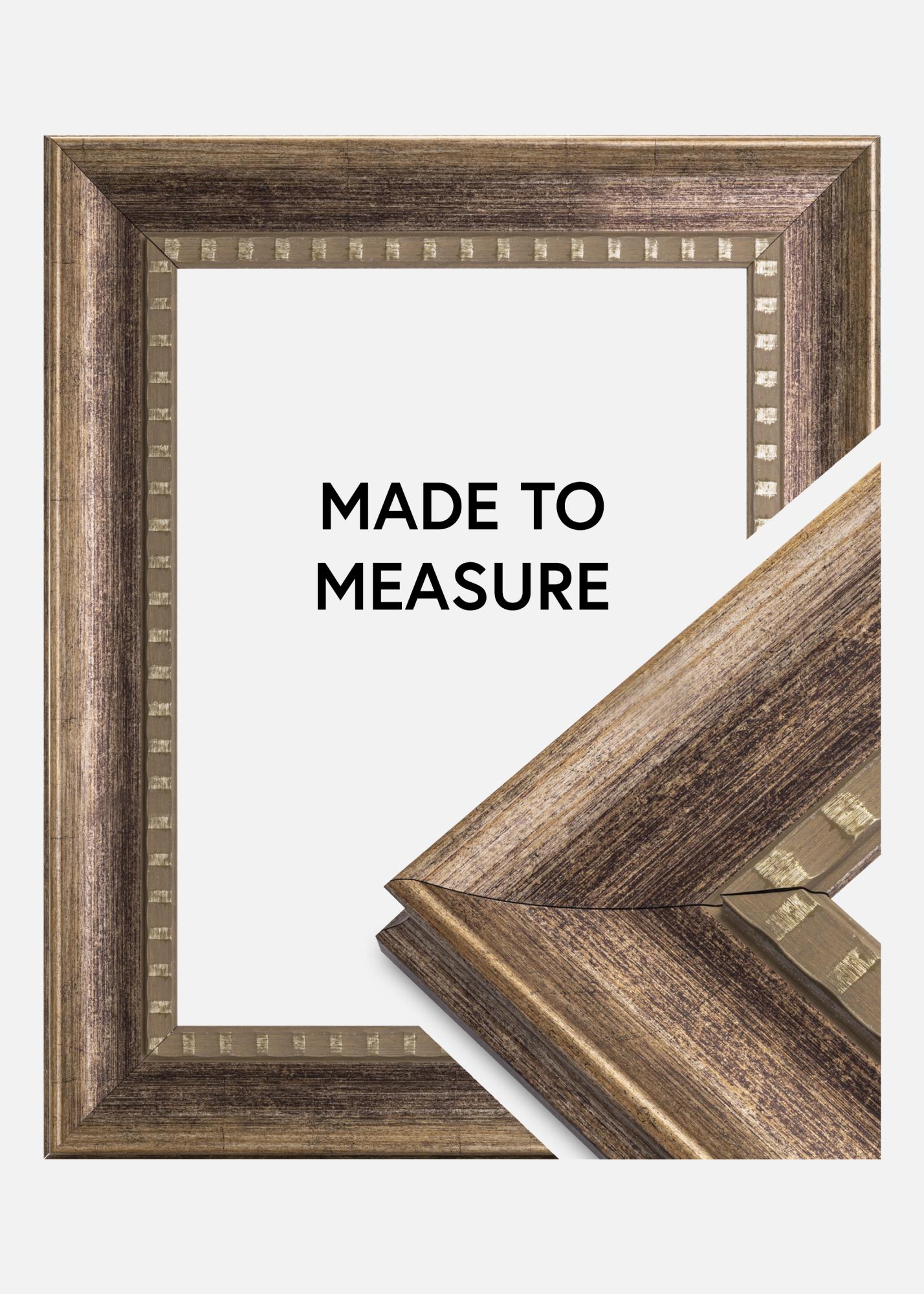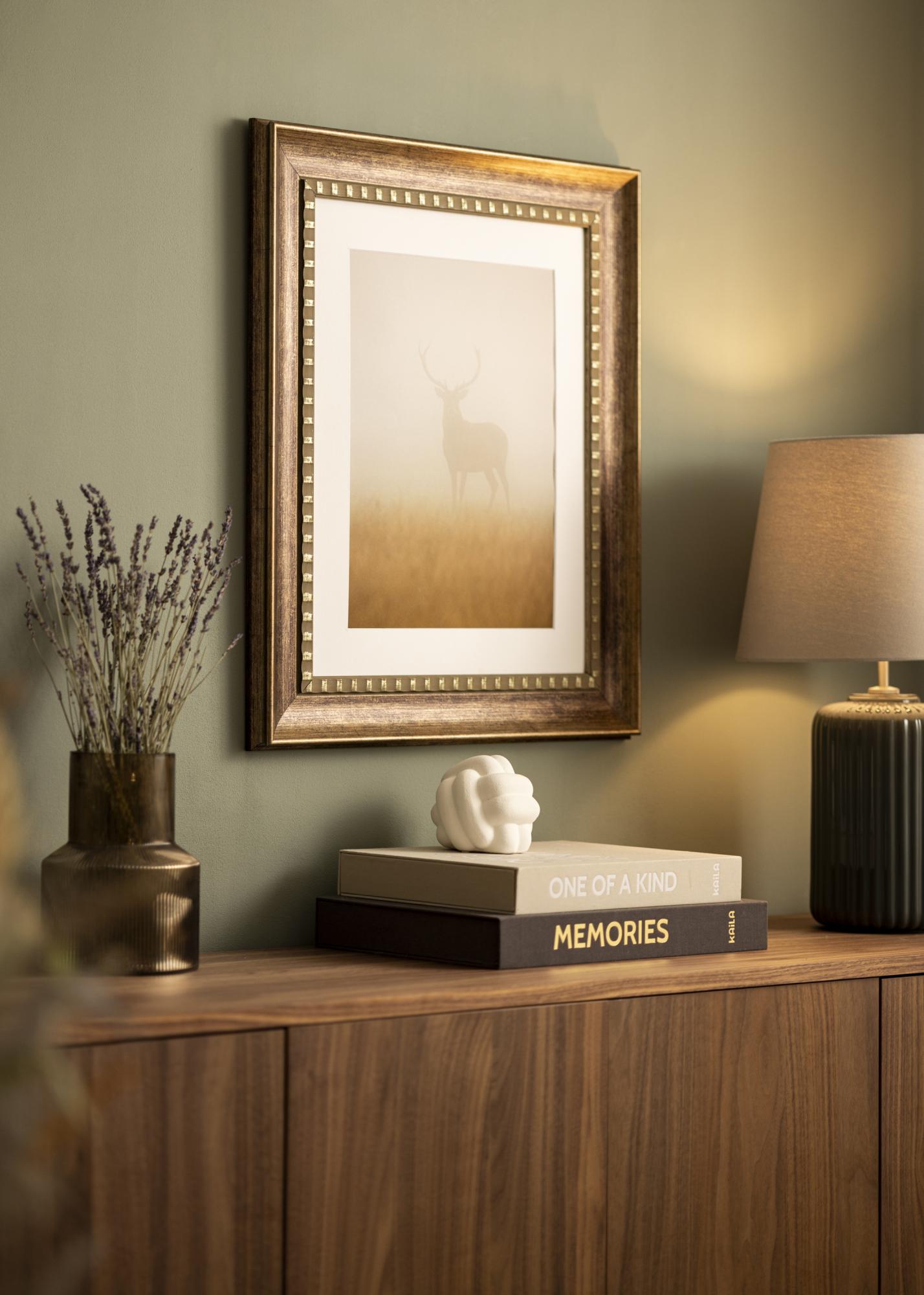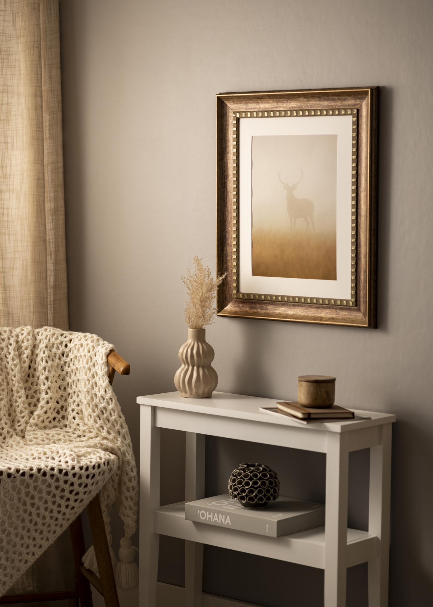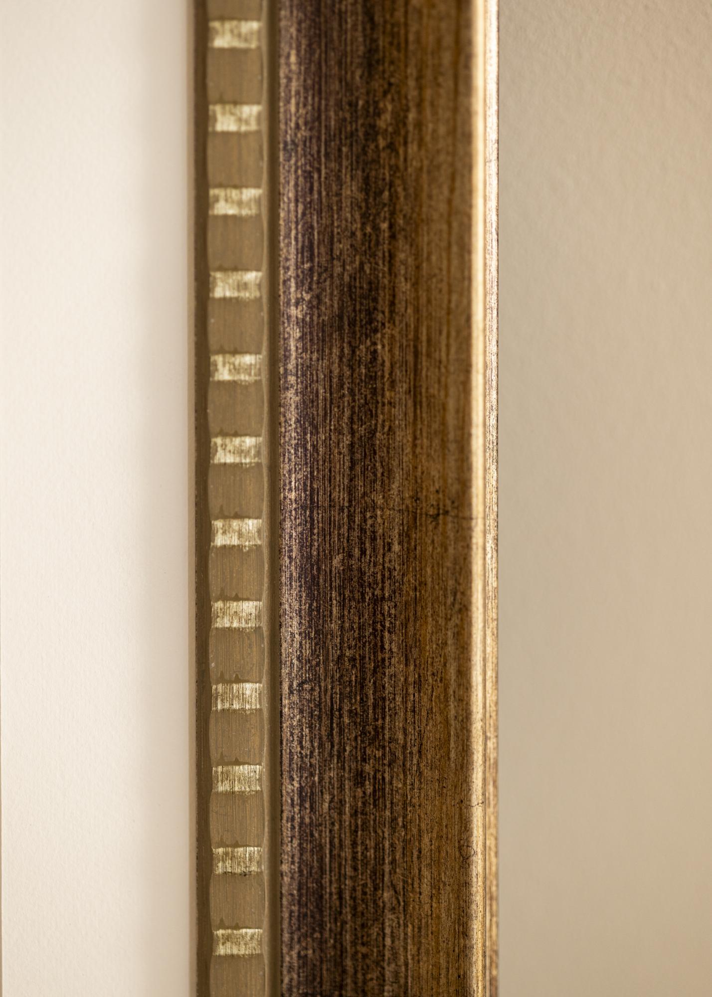 Camden Silver má teplou hnědou barvu s jemným antickým povrchem, který mu dodává rustikální charakter. Povrch je opatřen lehkou texturou, která napodobuje přírodní dřevo, což posiluje jeho vintage vzhled. Dekorativní vnitřní hrana je zdobena malými, pravidelnými detaily ve zlaté barvě, které vytvářejí elegantní kontrast s tmavším tónem dřeva. Vnější hrana má jemné zkosení s nenápadným zlatým povrchem, což dává rámu luxusní a nadčasový pocit.