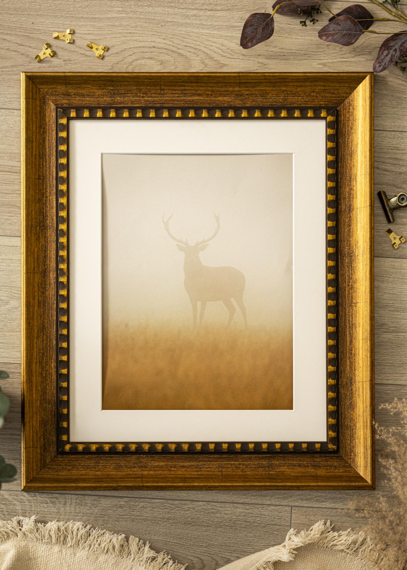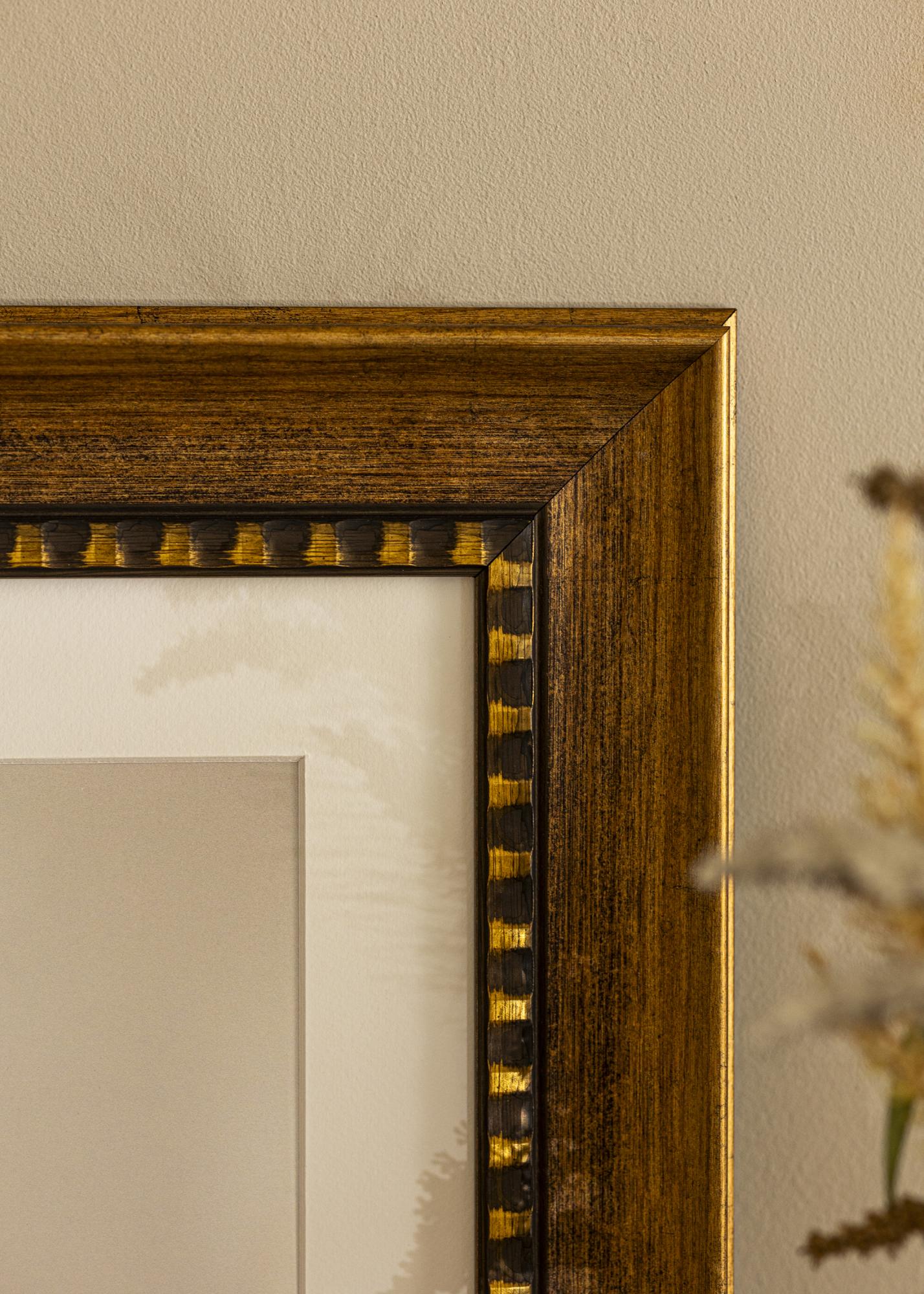 75 mm široká lišta rámu má jemný lesk a je zdobena výrazným proužkovým detailem ve zlaté a černé barvě podél vnitřního okraje. To dává rámu jedinečný charakter a činí ho ideálním pro zvýraznění klasických a tradičních uměleckých děl. Struktura dřeva je viditelná a přispívá k rustikálnímu pocitu, zatímco jemný zlatý okraj přidává nádech elegance.