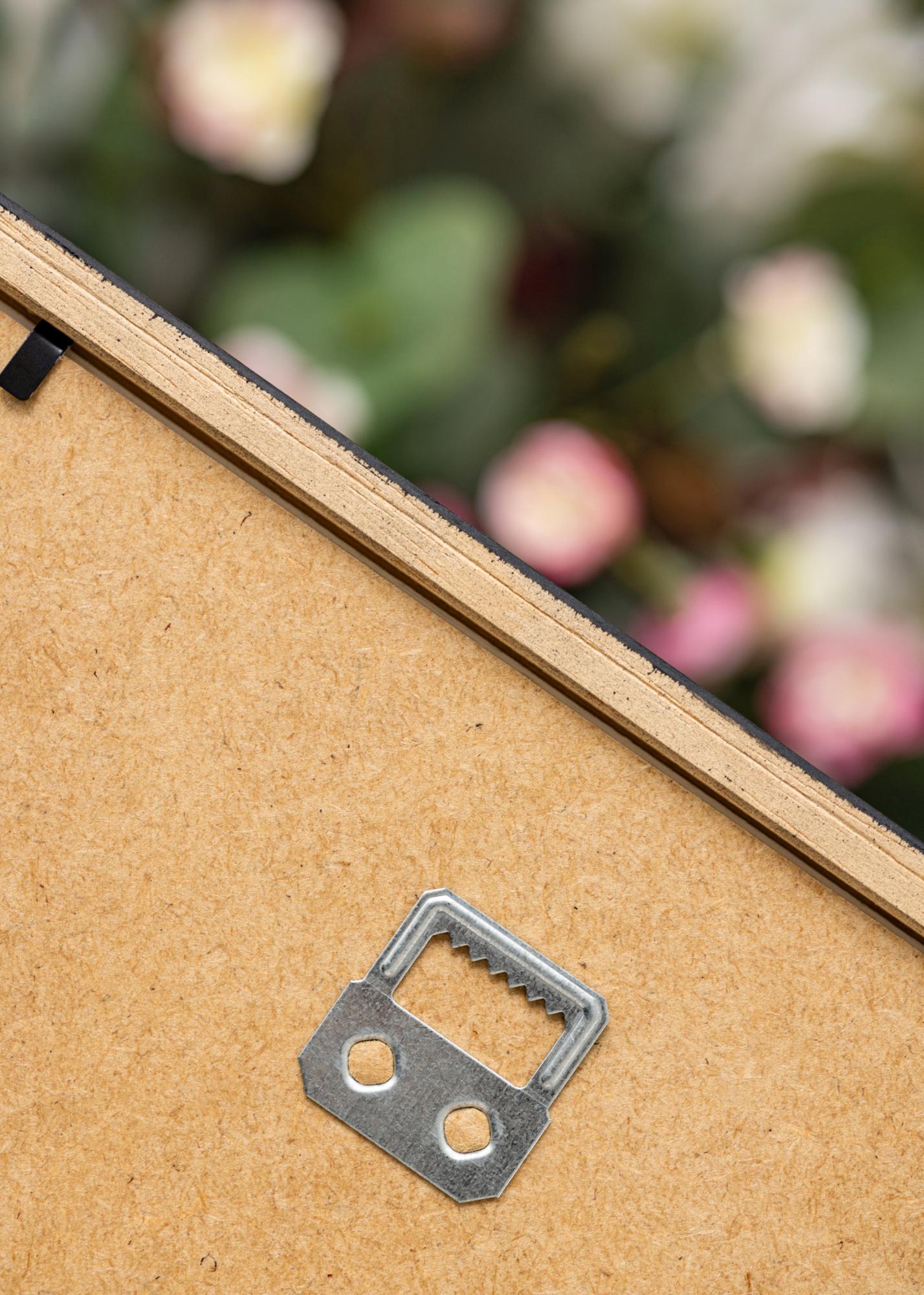 Tento rámeček na obrazy je dodáván s floatové sklo, což je sklo s o něco lepšími světelnými vlastnostmi než obvyklé sklo a navíc s 40–45% UV ochranou. Hnědá zadní strana je vyrobená z MDF a opatřená závěsnými očky pro vertikální i horizontální umístění. Zadní strana je držena na místě pomocí malých kovových kolíčků, které snadno ohnete, když chcete vložit svůj obrázek. Rám má hloubku drážky (vnitřní hloubku) 8 mm a dostatek prostoru v případě, že chcete svůj motiv doplnit elegantní paspartou.