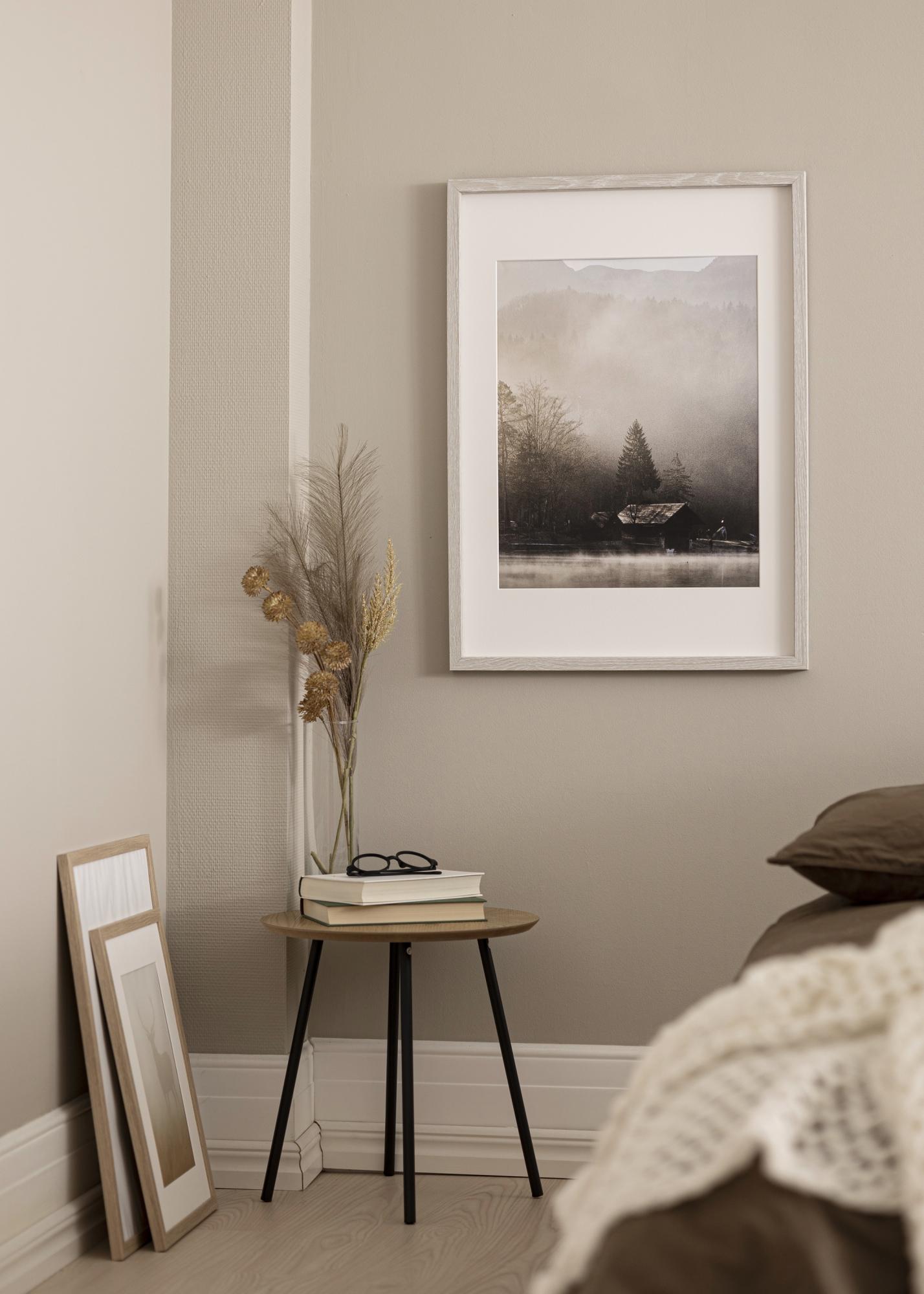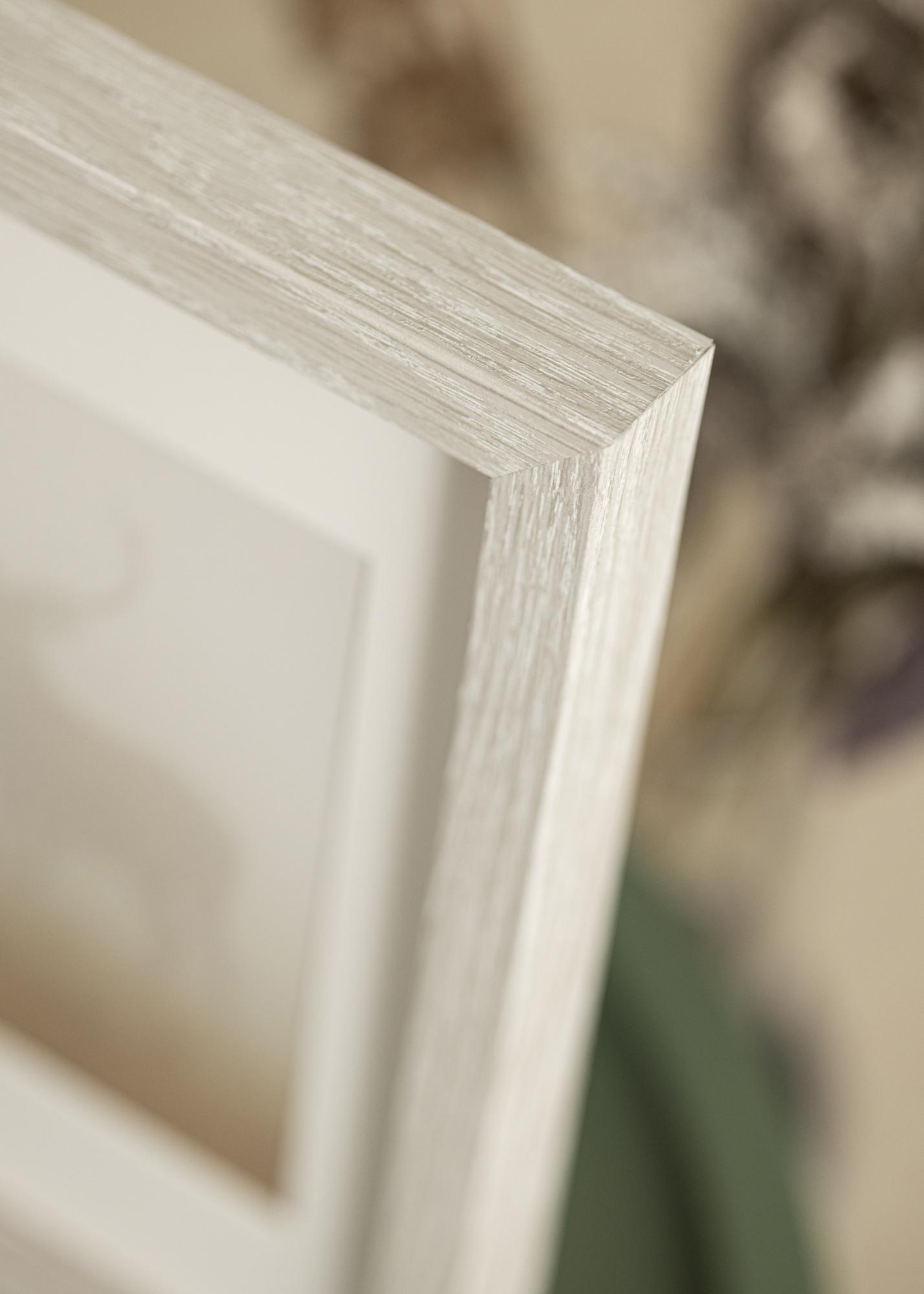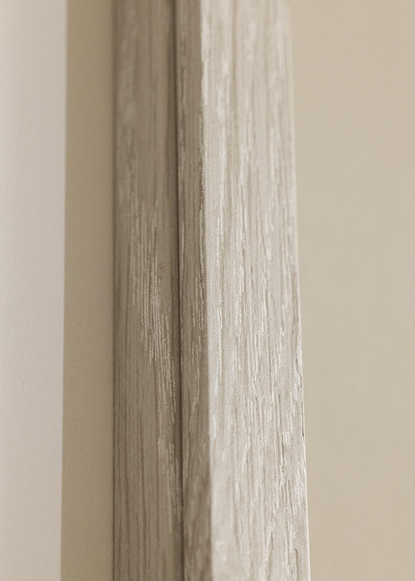 Stylový boxový rám s žilkovaným bílým dřevěným povrchem s hloubkou celých 30 mm. K rámu je také přiložen distanční proužek, který umožňuje snadné zarámování jiných věcí než jen obrázků, například různých pamětních předmětů. To činí "Elegantní Box Šedá" rámem s velmi mnoha možnostmi. K rámu je také přiložen bílý passepartout.