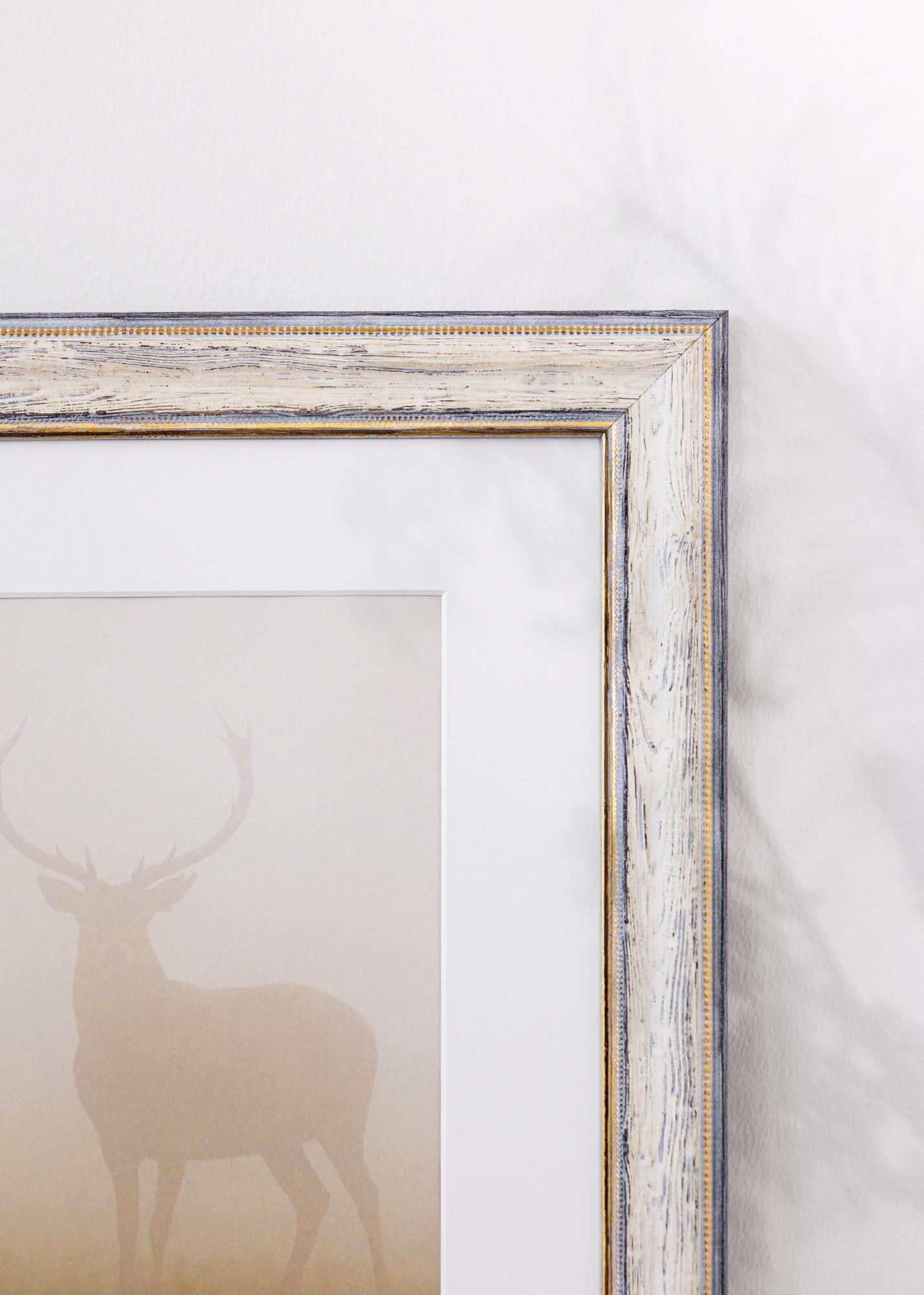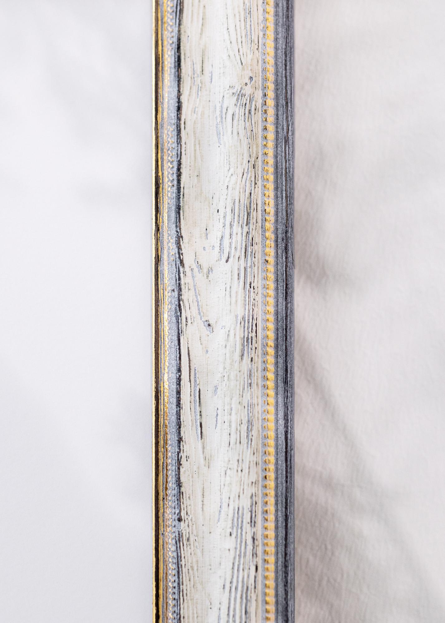 Tento elegantní rám je dokonalou kombinací vintage inspirace a moderní funkčnosti. Se svým rustikálním bílým a šedým dřevěným povrchem nabízí rám kouzelně zestárlý vzhled, který se skvěle hodí do venkovských a šik zařízení. Jemné zlaté detaily podél vnitřního okraje dodávají klasický nádech, který umocňuje vaše fotografie a umělecká díla sofistikovaným způsobem.