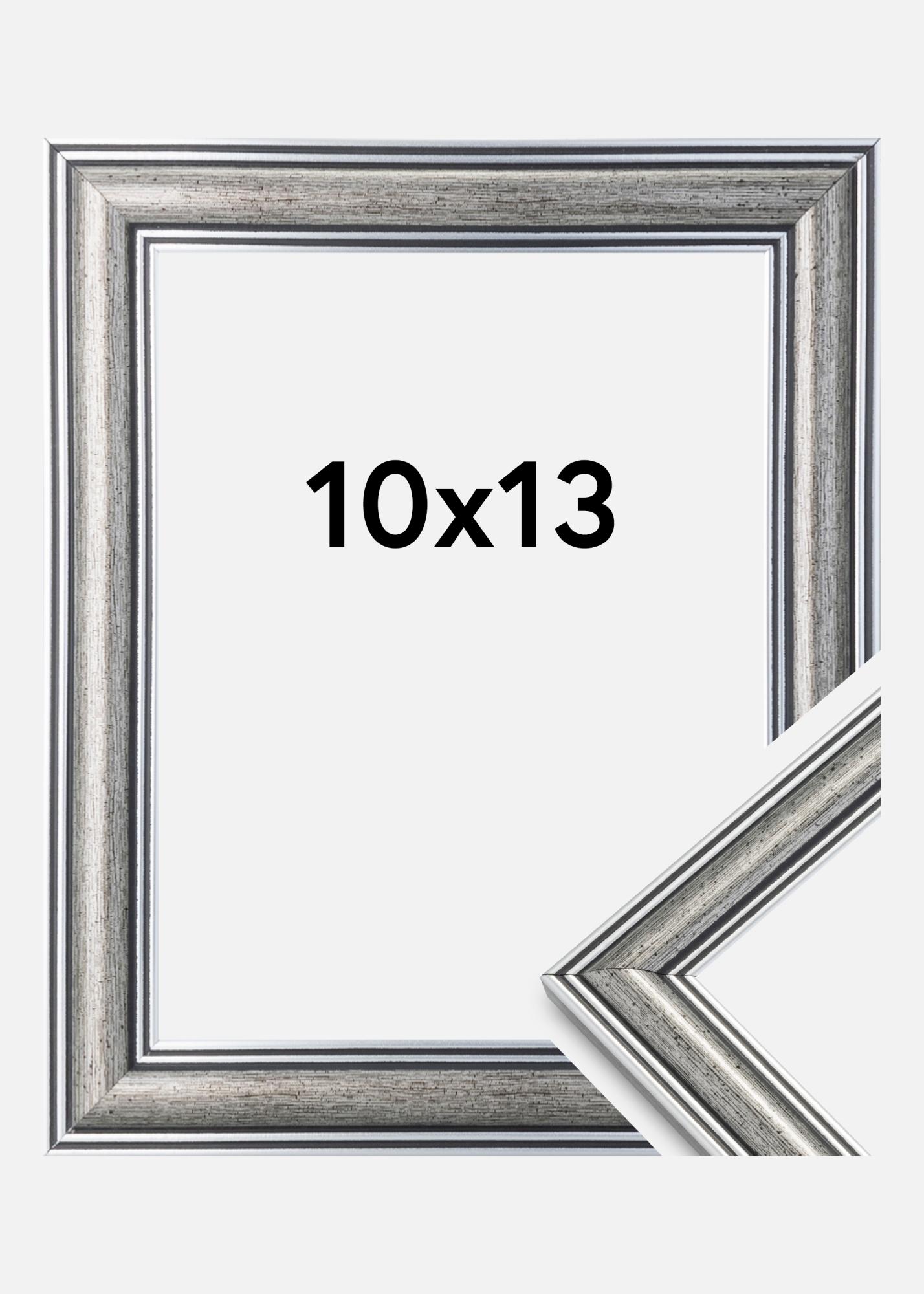 Spusťte výběr rámu »Frigg je stříbrný rámeček s černými liniemi a černými skvrnitými prvky. Skvěle se hodí, když hledáte široký tradiční stříbrný rámeček vhodný pro mnoho typů obrázků a prostředí.