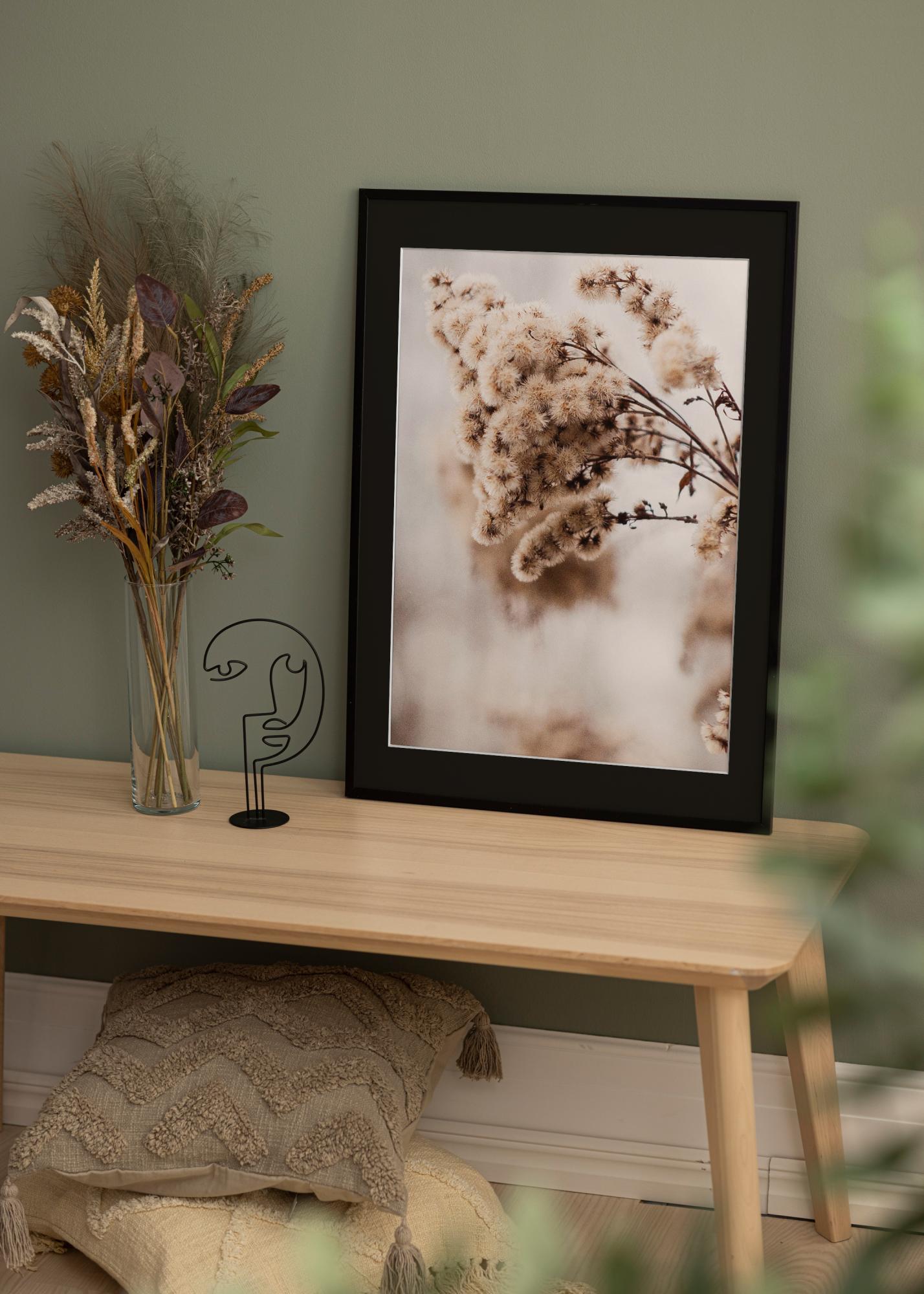 Rám je vyroben s elegantním profilem o šířce a hloubce 13 mm, což poskytuje pěknou rovnováhu mezi robustností a nenápadností. Matný povrch rámu doplňuje paspartu a pomáhá snižovat rušivé odrazy. Rám je také vybaven kovovými závěsy na zadní straně, což usnadňuje zavěšení obrazu jak horizontálně, tak vertikálně, v závislosti na orientaci obrázku.