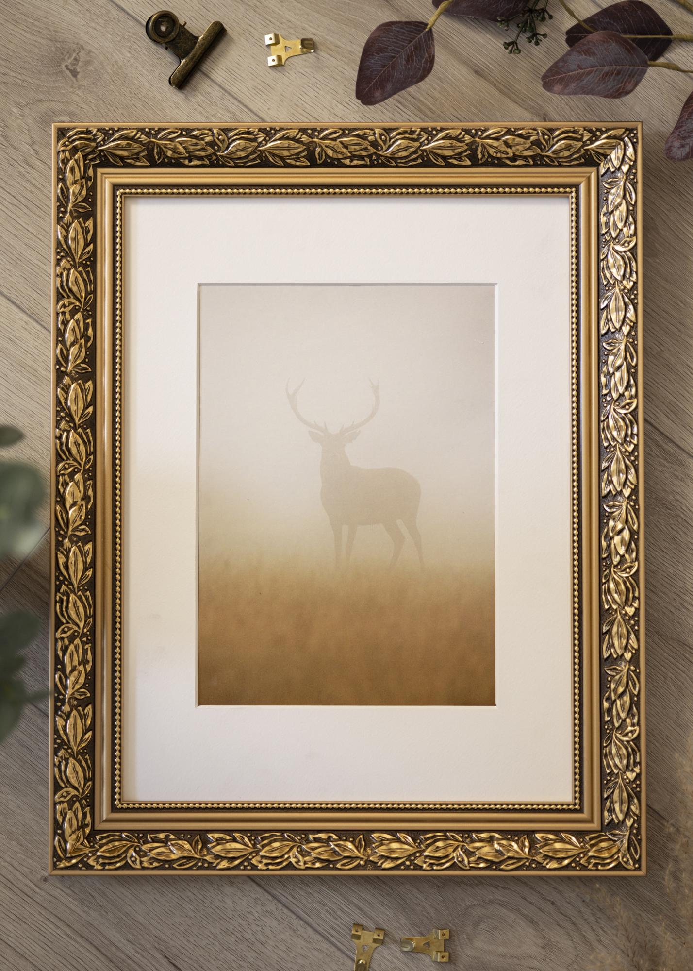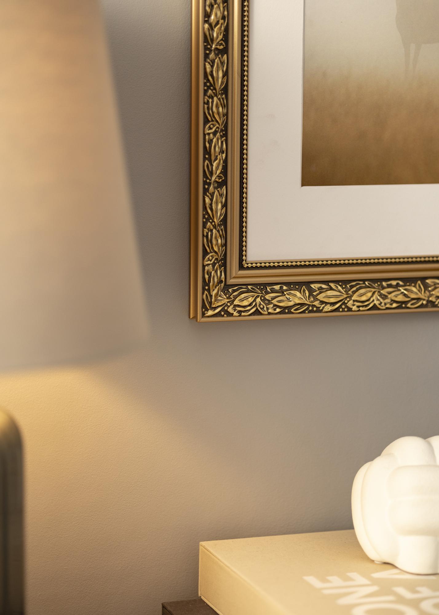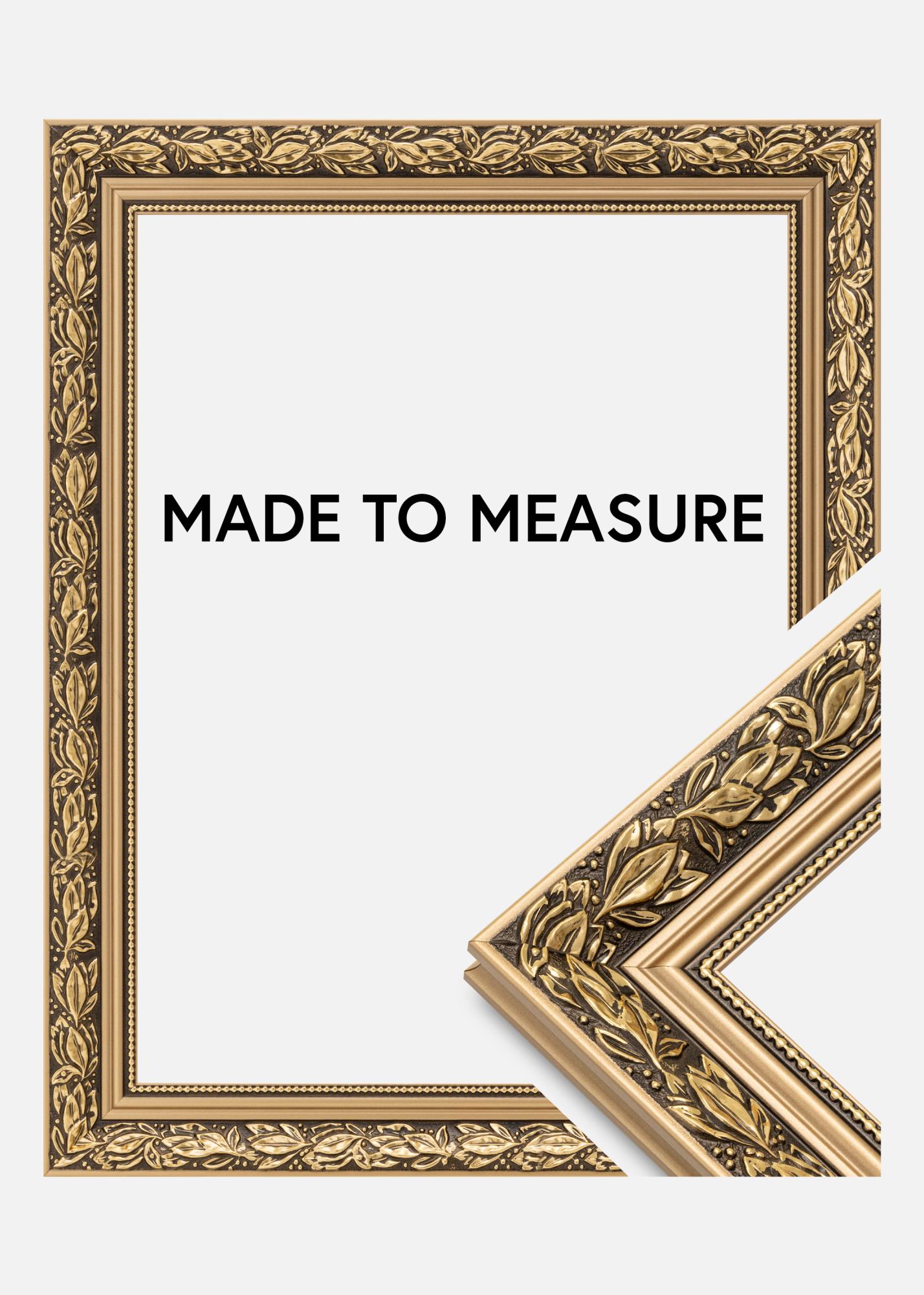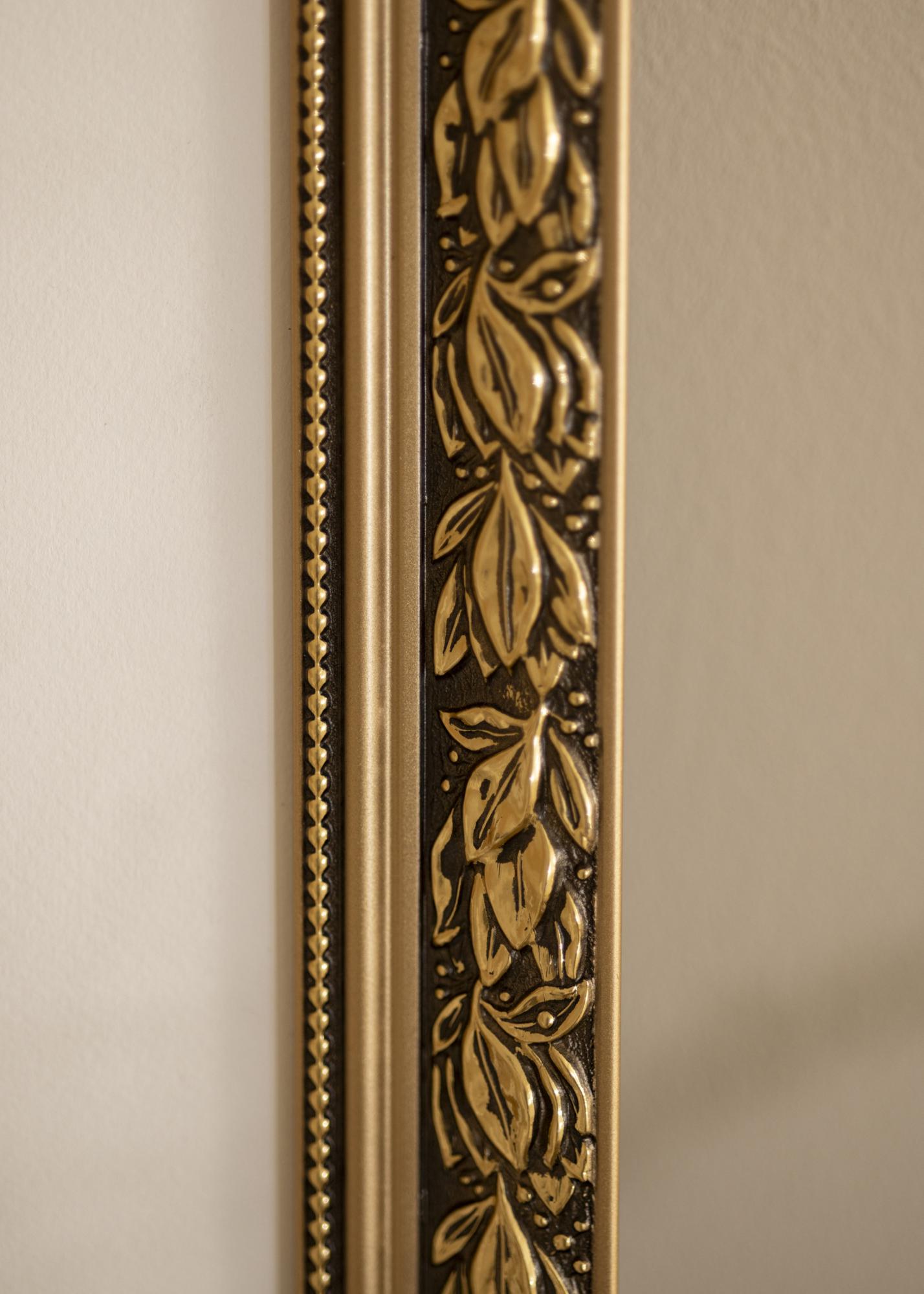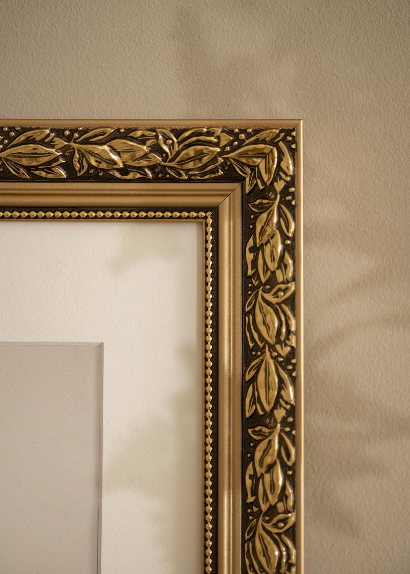 Cenný obraz si zaslouží krásný rám! Zde máme romantický designovaný rám obrazu se zlatými okraji, kudrnatými listovými vzory ve zlaté barvě na hnědém pozadí a milou zlatou stužkou s perlovými tvary nejblíže sklu. Použijte jej na starou černobílou fotografii, kterou jste zdědili, nebo vytvořte vzrušující kontrast s nově pořízeným snímkem. Protože je rám vyráběn podle vašich rozměrových údajů, můžete si být jisti, že vám přesně padne, kam chcete!