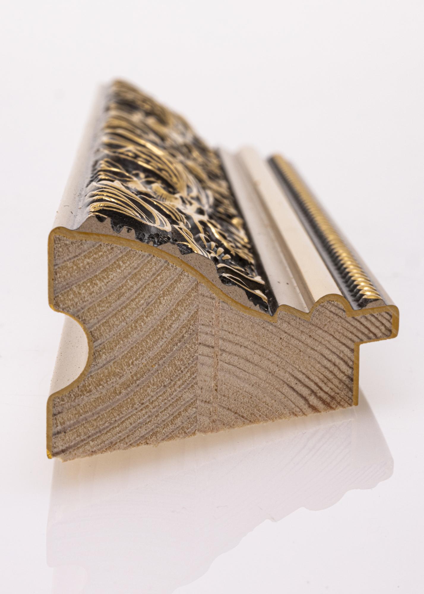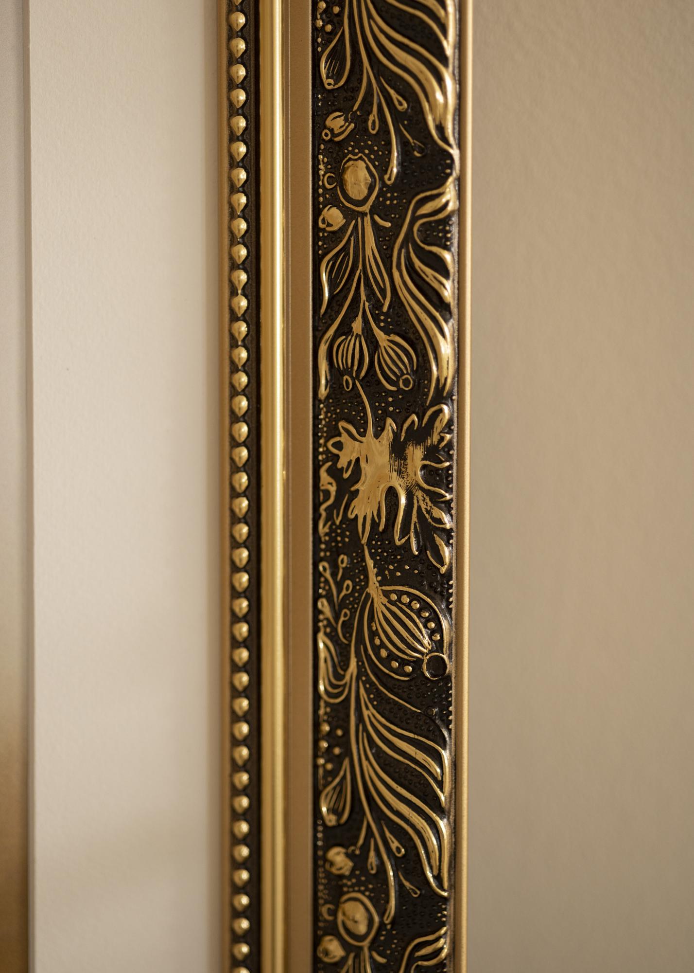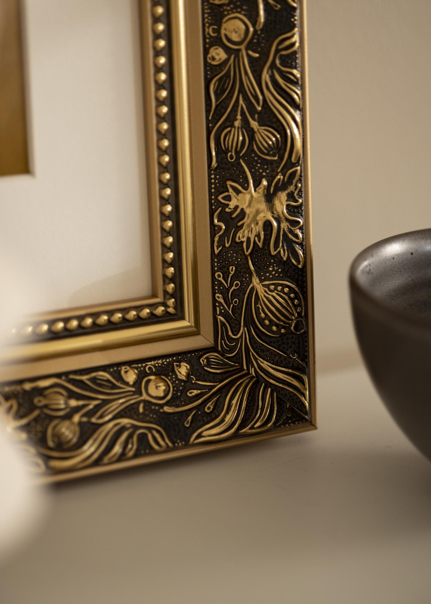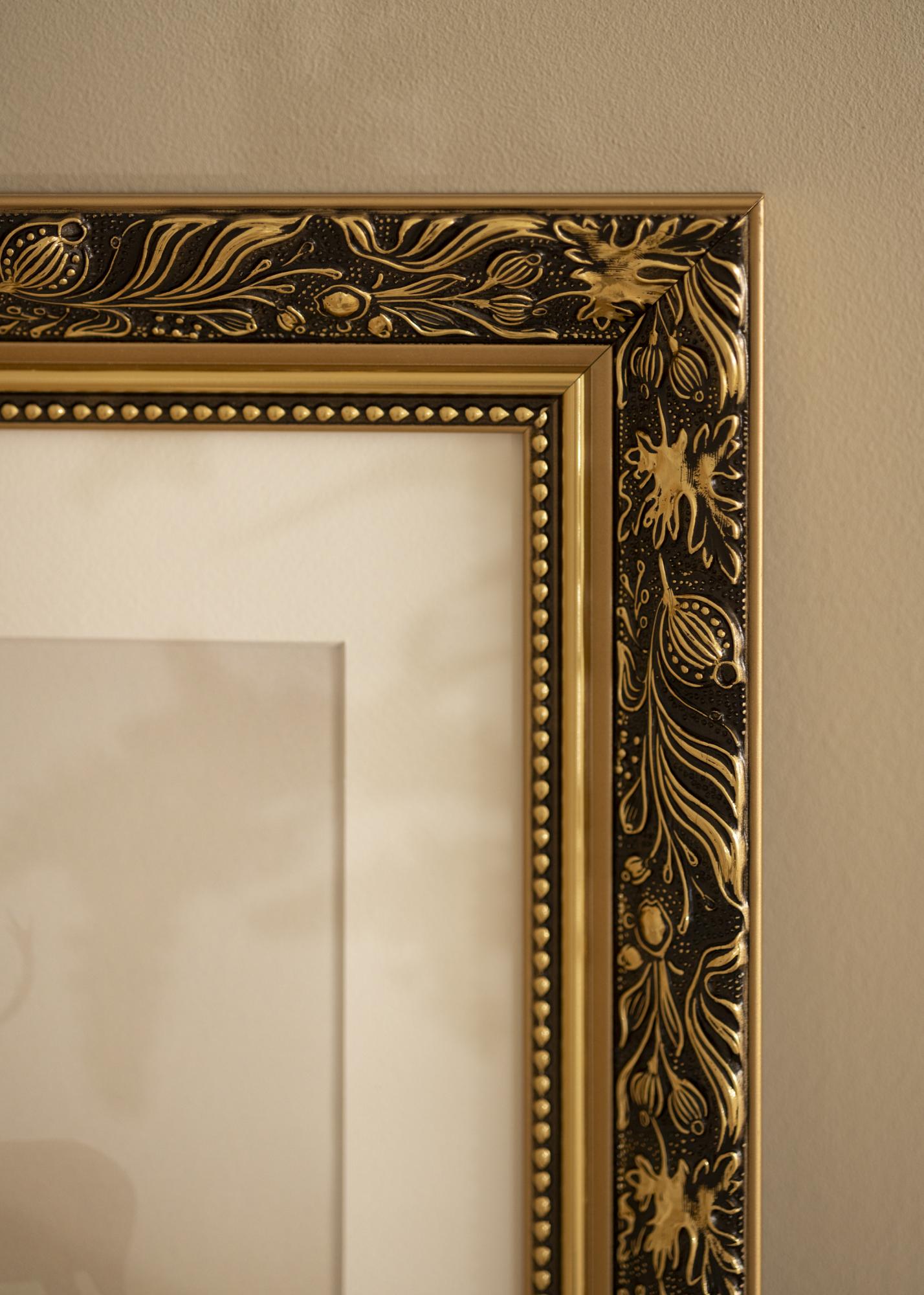 Povyšte své fotografie na novou úroveň s tímto luxusním rámem na obraz! Rám má dvojitý profil, což na zdi vypadá velmi pěkně. Okraje jsou celé ve zlatě, zatímco přední strana je černá s krásným zlatým vzorem listů a různorodých tvarů. Nejblíže ke sklu vede zlatý okraj a černá část s perlou ve zlatém provedení. Protože je rám vyroben na základě vašich rozměrů, můžete si být jisti, že se perfektně hodí právě tam, kde ho chcete mít.