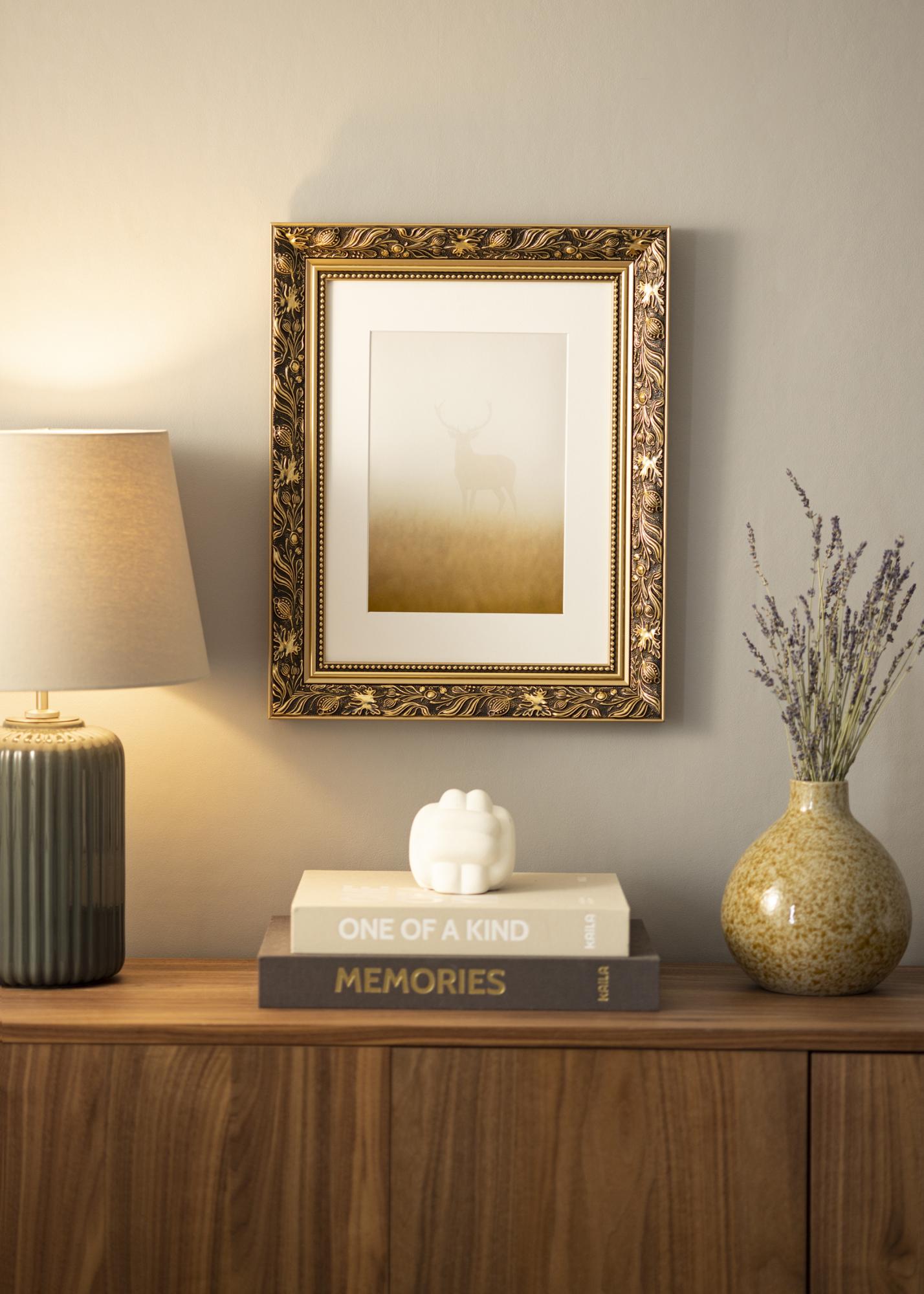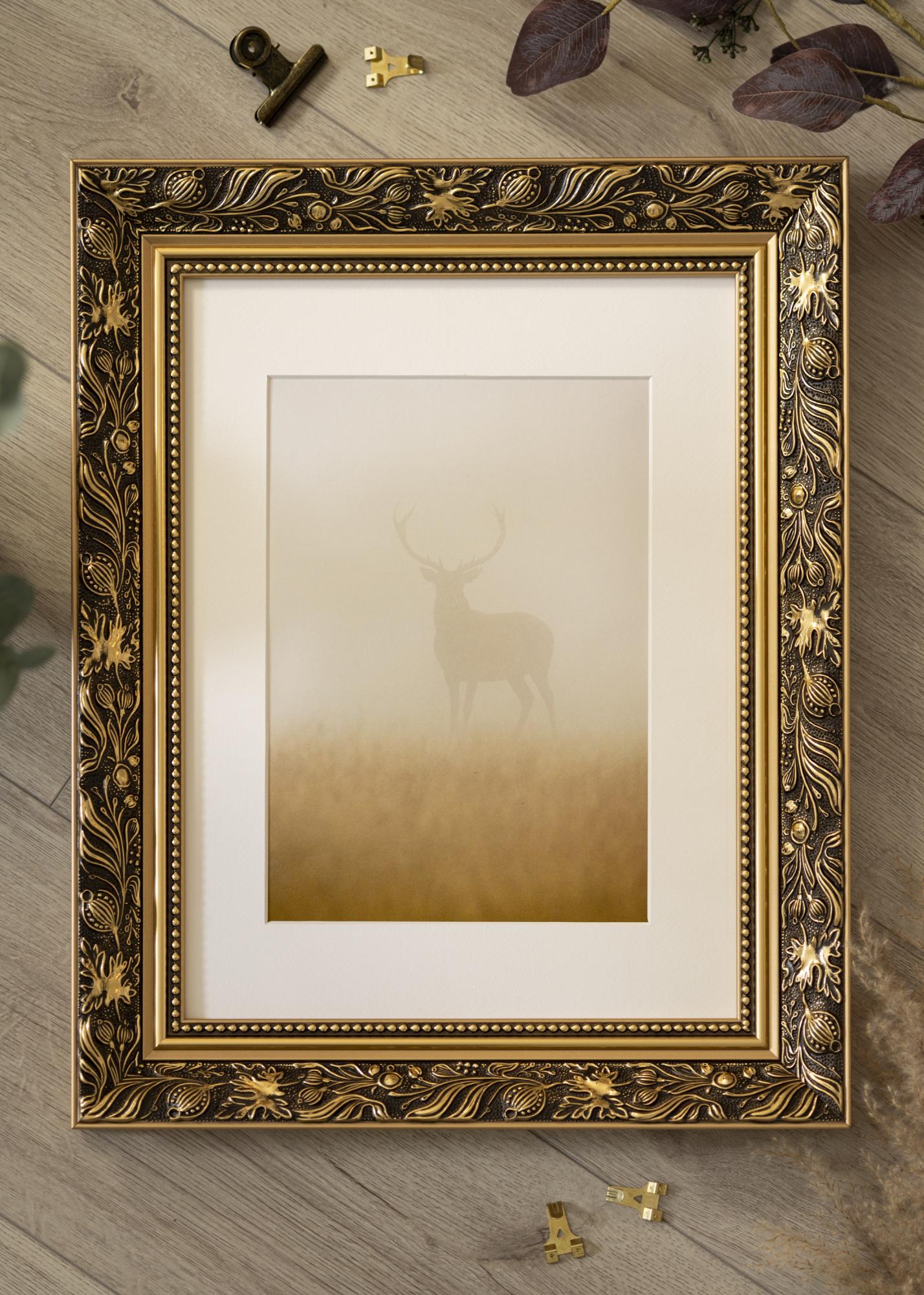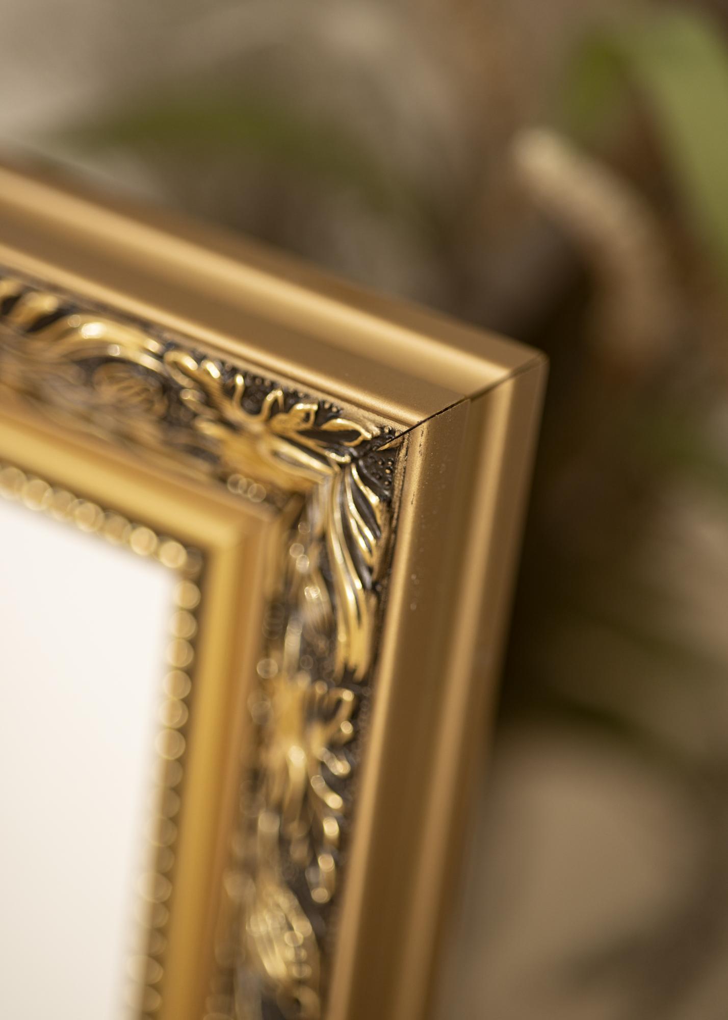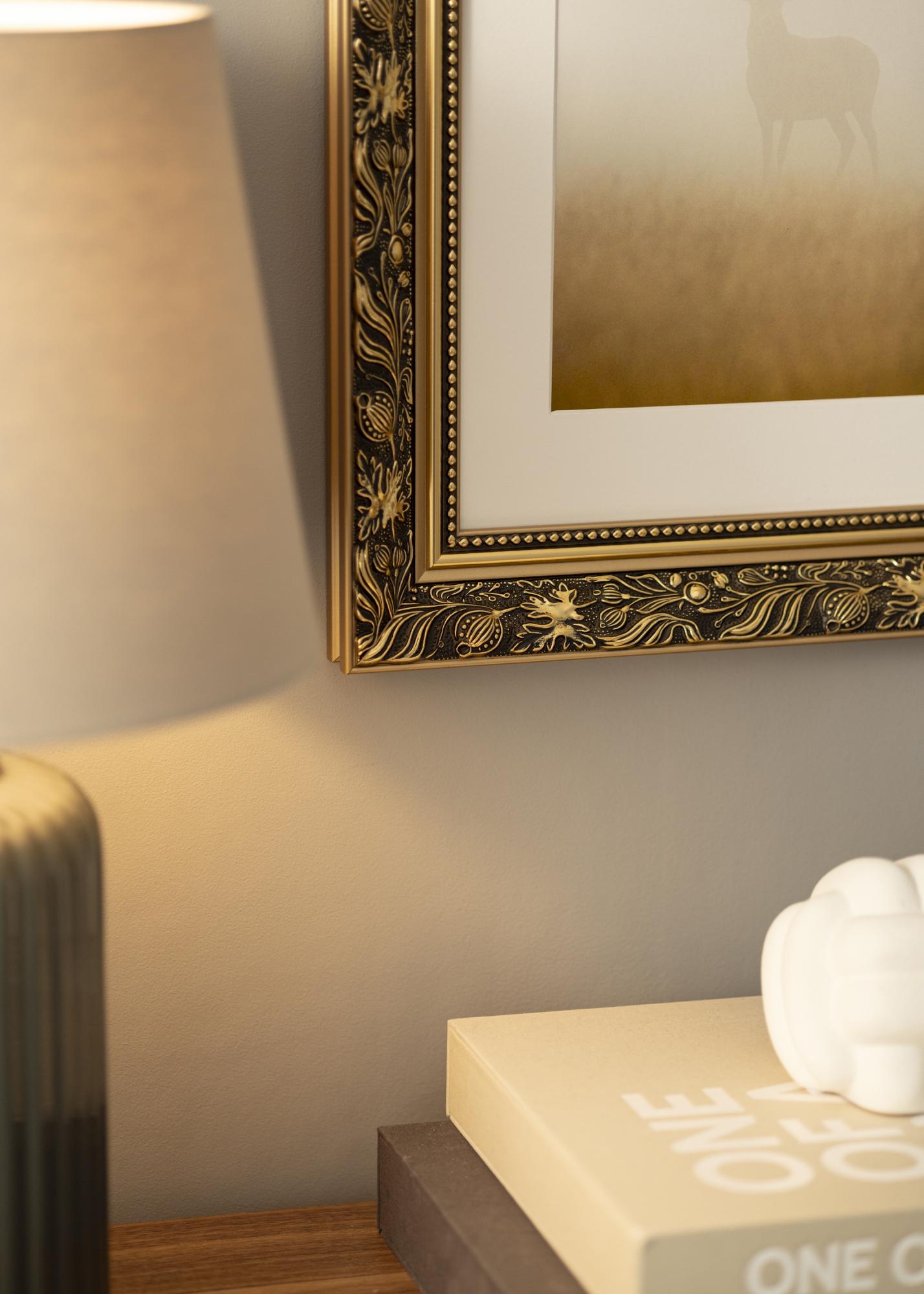 Povyšte své fotografie na novou úroveň s tímto luxusním rámem na obraz! Rám má dvojitý profil, což na zdi vypadá velmi pěkně. Okraje jsou celé ve zlatě, zatímco přední strana je černá s krásným zlatým vzorem listů a různorodých tvarů. Nejblíže ke sklu vede zlatý okraj a černá část s perlou ve zlatém provedení. Protože je rám vyroben na základě vašich rozměrů, můžete si být jisti, že se perfektně hodí právě tam, kde ho chcete mít.
