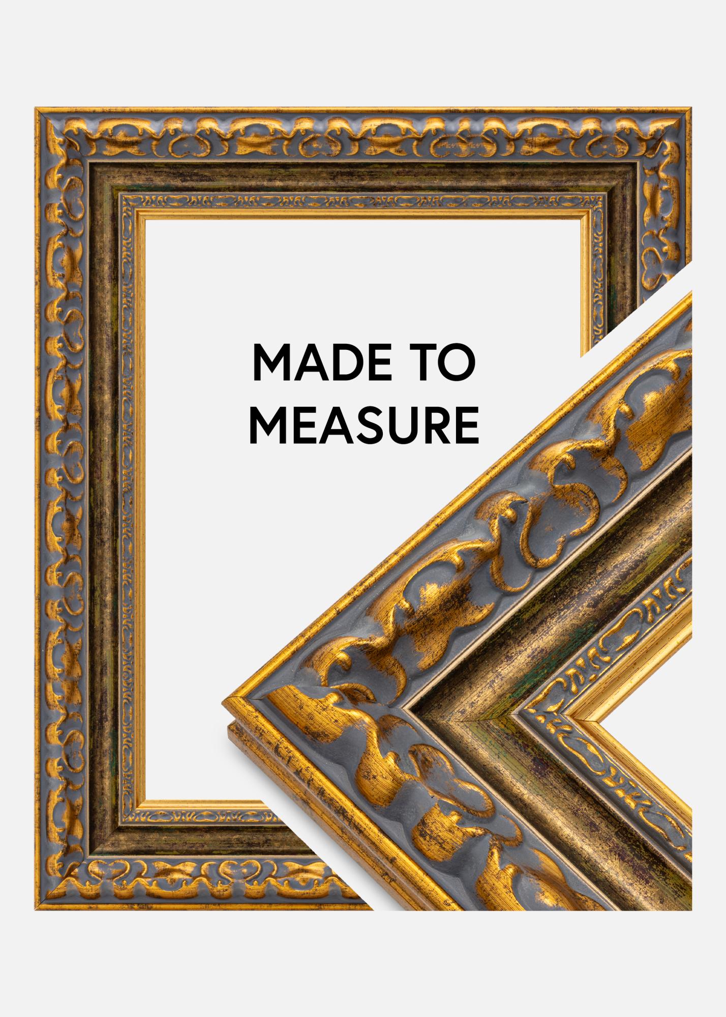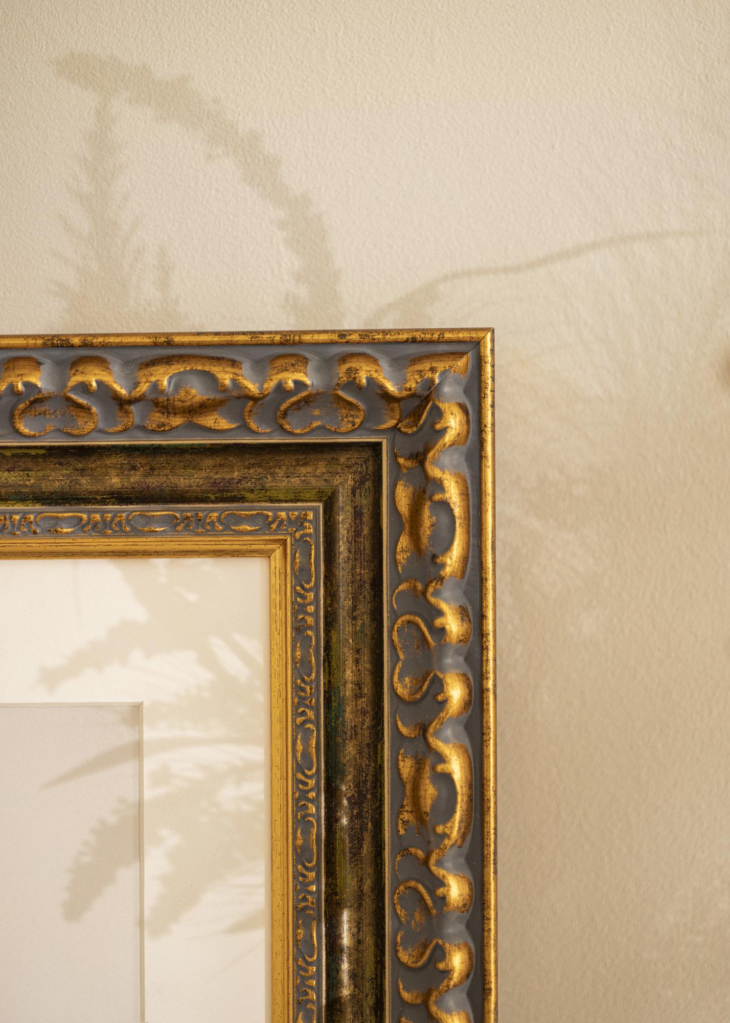 Chcete složit nádherný obraz se starou rodinnou fotografií nebo pěkným obrázkem rodiny? Pak zde máme luxusní rám, který přidává charakter a přitahuje pozornost! Rám je vkusně opotřebovaný se vzory, které se střídají ve zlaté a šedé, respektive zlaté, zelené a hnědé barvě. Protože je vyráběn v naší vlastní rámové dílně, můžete si být jisti, že dostanete krásný rám vysoké kvality.