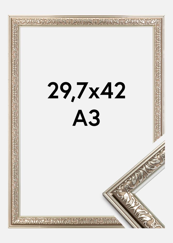 Spusťte výběr rámu »Nostalgia je elegantní stříbrný rámeček v retro stylu s krásnými ozdobami. Hodí se, když hledáte široký retro rámeček na vaše nejkrásnější obrázky.