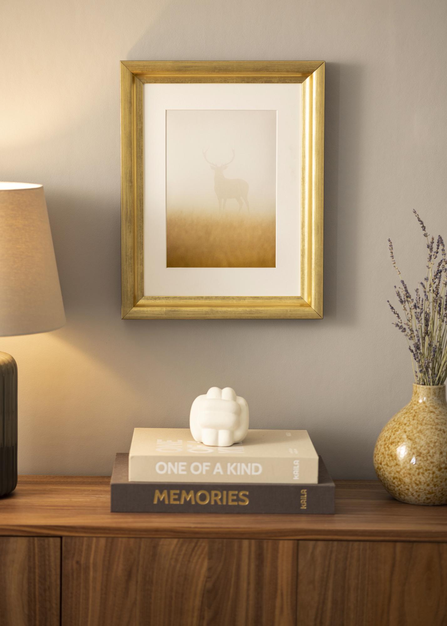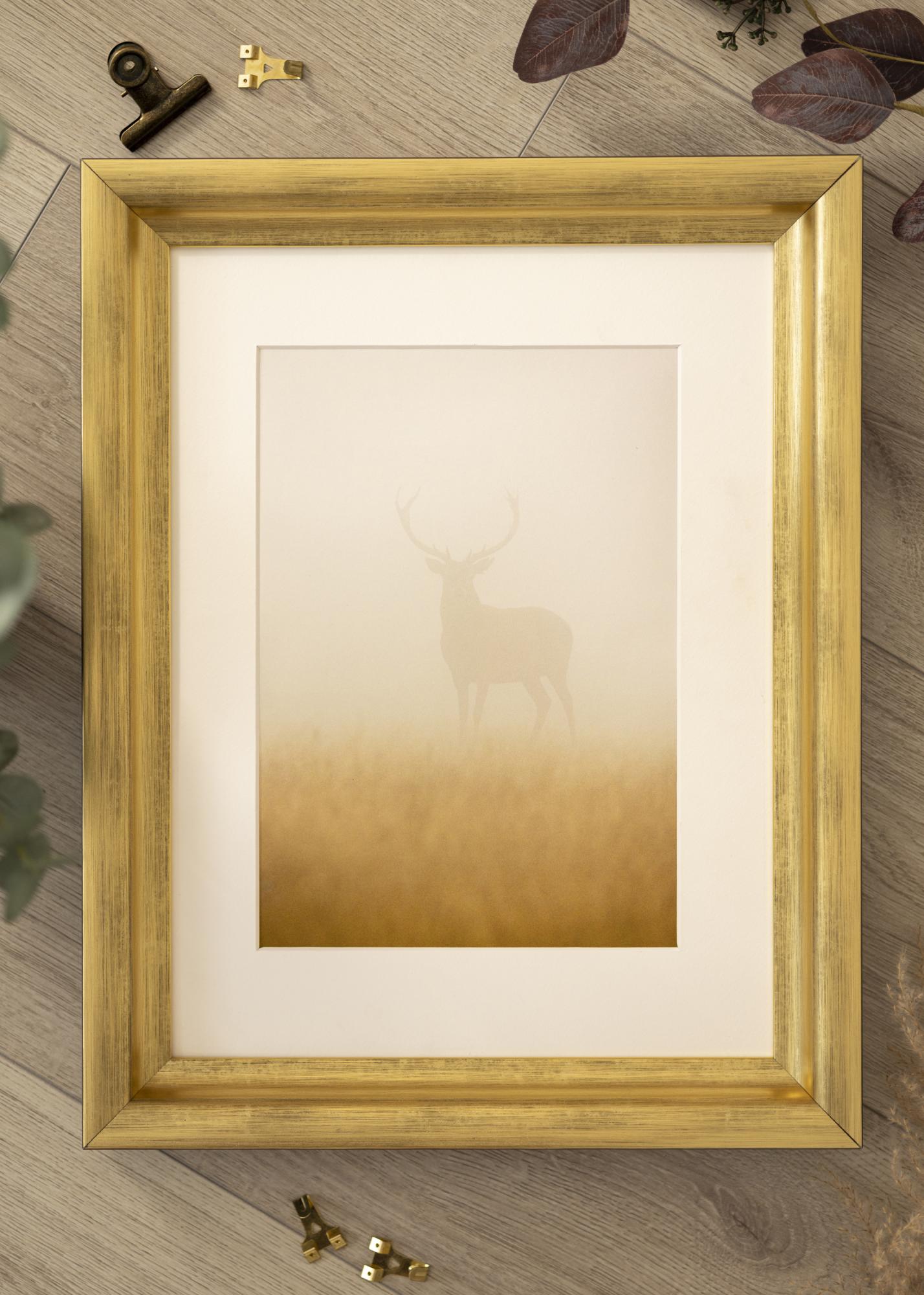 Klasický rámeček na obrazy, kde si sami zvolíte, jak velký rám chcete mít. Se svou širokou a hlubokou profilovou částí je to zaručeně rám, který upoutá pozornost. Rám má měkký příjemný zlatý tón, který poskytuje útulný a krásný pocit motivu.