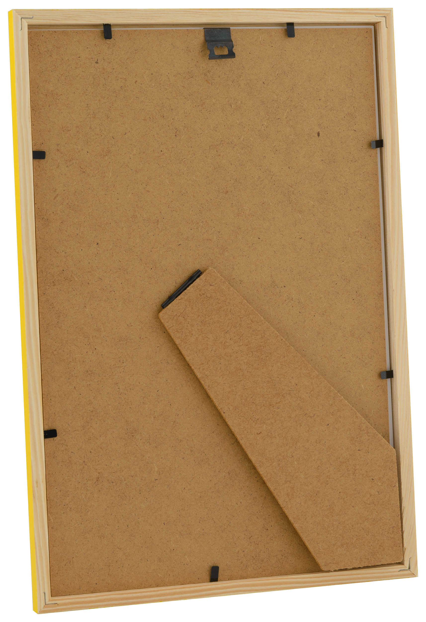 Tento obrazový rám má tenkou lištu, která je 12 mm široká a 12 mm hluboká. Na zadní straně je nástěnný úchyt a zadní deska vyrobená z MDF. Při vkládání obrázku uvolníte zadní desku pomocí ohebných kolíčků, které drží desku na místě, a poté můžete vložit svůj motiv.