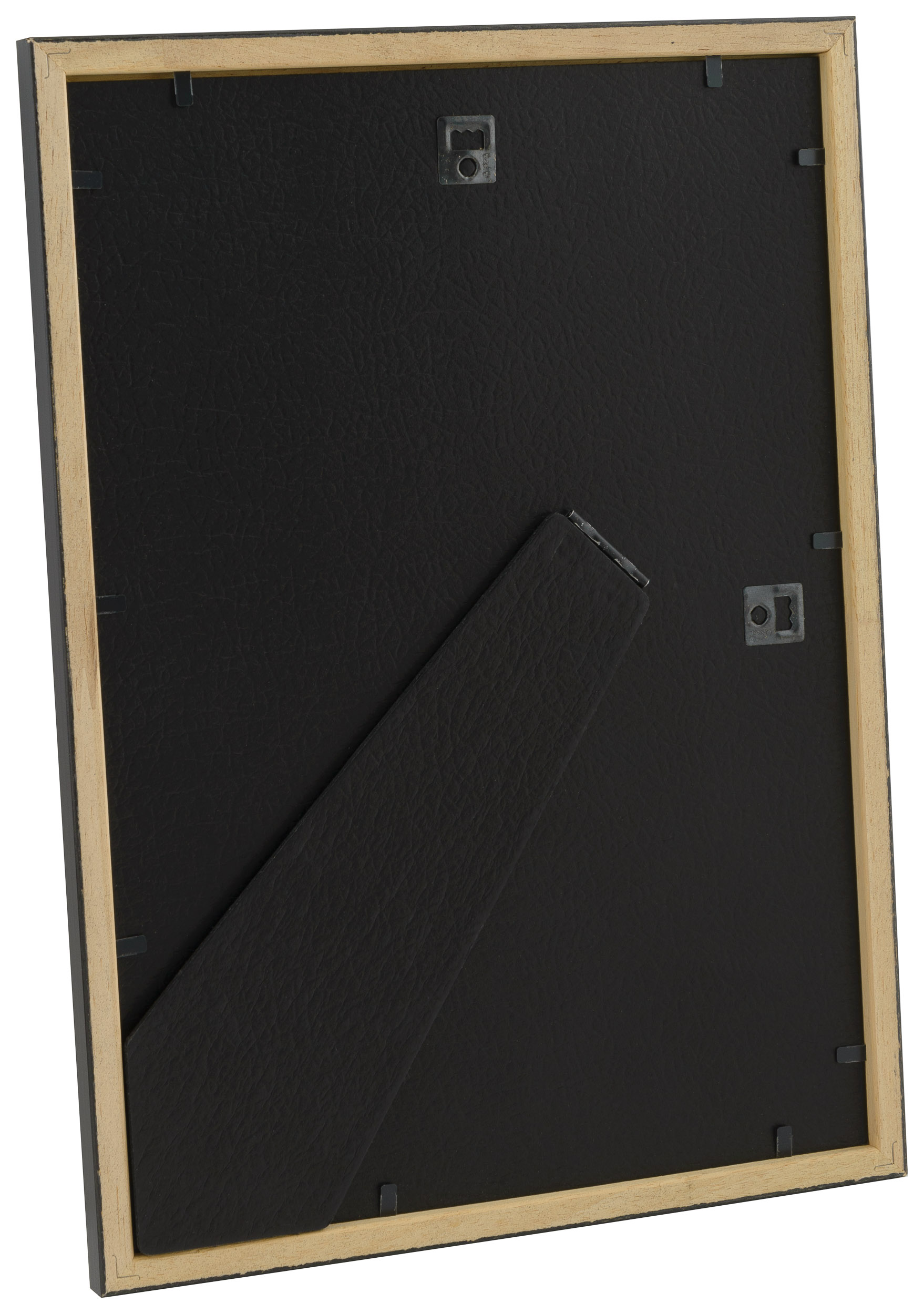 Uložte svou fotografii, malbu nebo plakát do tohoto stylového rámečku! Rám je vyroben z černě natřeného dřeva a má antireflexní sklo. Zadní strana a stojan jsou potaženy černou imitací kůže, což dodává extra luxusní pocit.