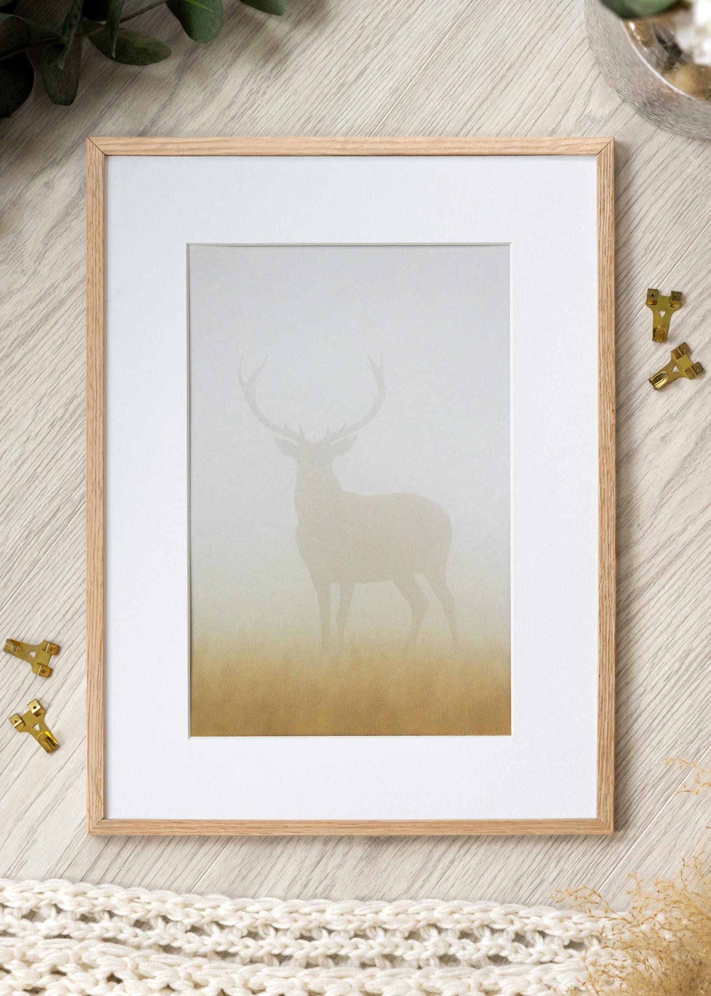 Rám je vyroben z dubového dřeva a má přírodní odstín s neupraveným povrchem. Je vybaven akrylátovým sklem, jehož výhodou je, že je lehké a odolné proti rozbití – a zároveň má stejnou čistou ostrost jako běžné sklo!