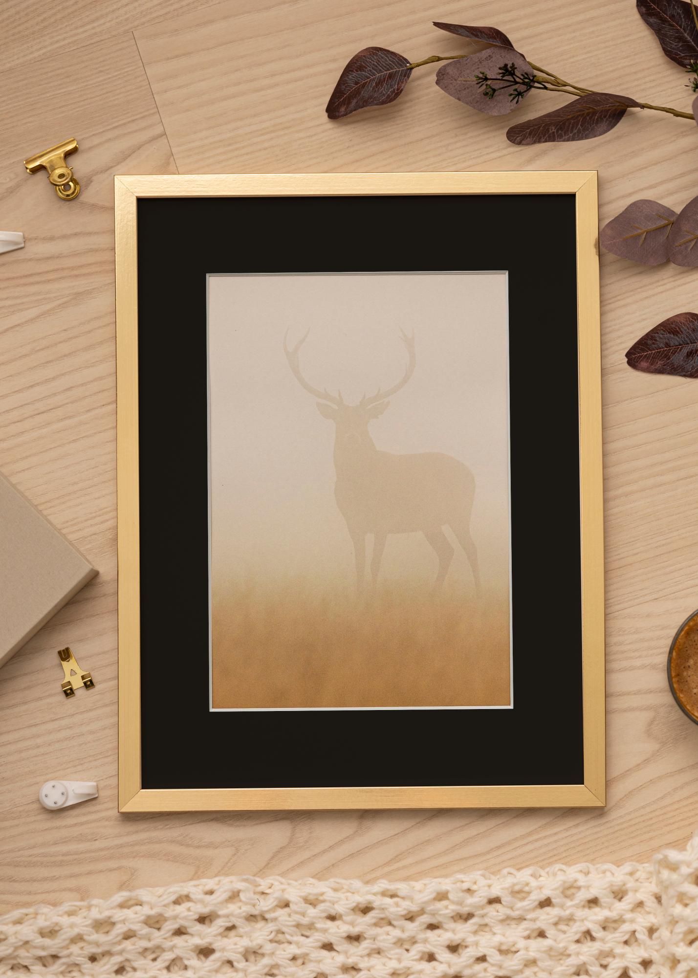 Lesklé zlaté provedení rámu dodává vašemu interiéru luxusní prvek a jeho šířka a hloubka 15 mm vytváří jemnou rovnováhu mezi rámem a obrazem. Černá barva paspartu funguje jako neutrální pozadí, které umožňuje vyniknout barvám na vašem obrázku, zatímco zároveň chrání obraz před přímým kontaktem se sklem.