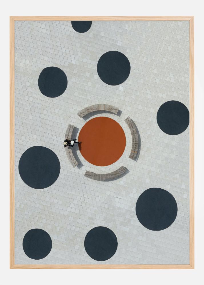 Tento konceptuální plakát zachycuje výrazný, ptačí pohled na čtoucí osobu obklopenou symetrickou a grafickou kompozicí. Abstraktní design bílé dlaždicové plochy, doplněné velkými černými kruhy a centrálním rezavě červeným kruhem s lavičkami, vytváří silný vizuální kontrast. Tento plakát není jen poctou designu a architektuře, ale také hravým výkladem každodenních scén.