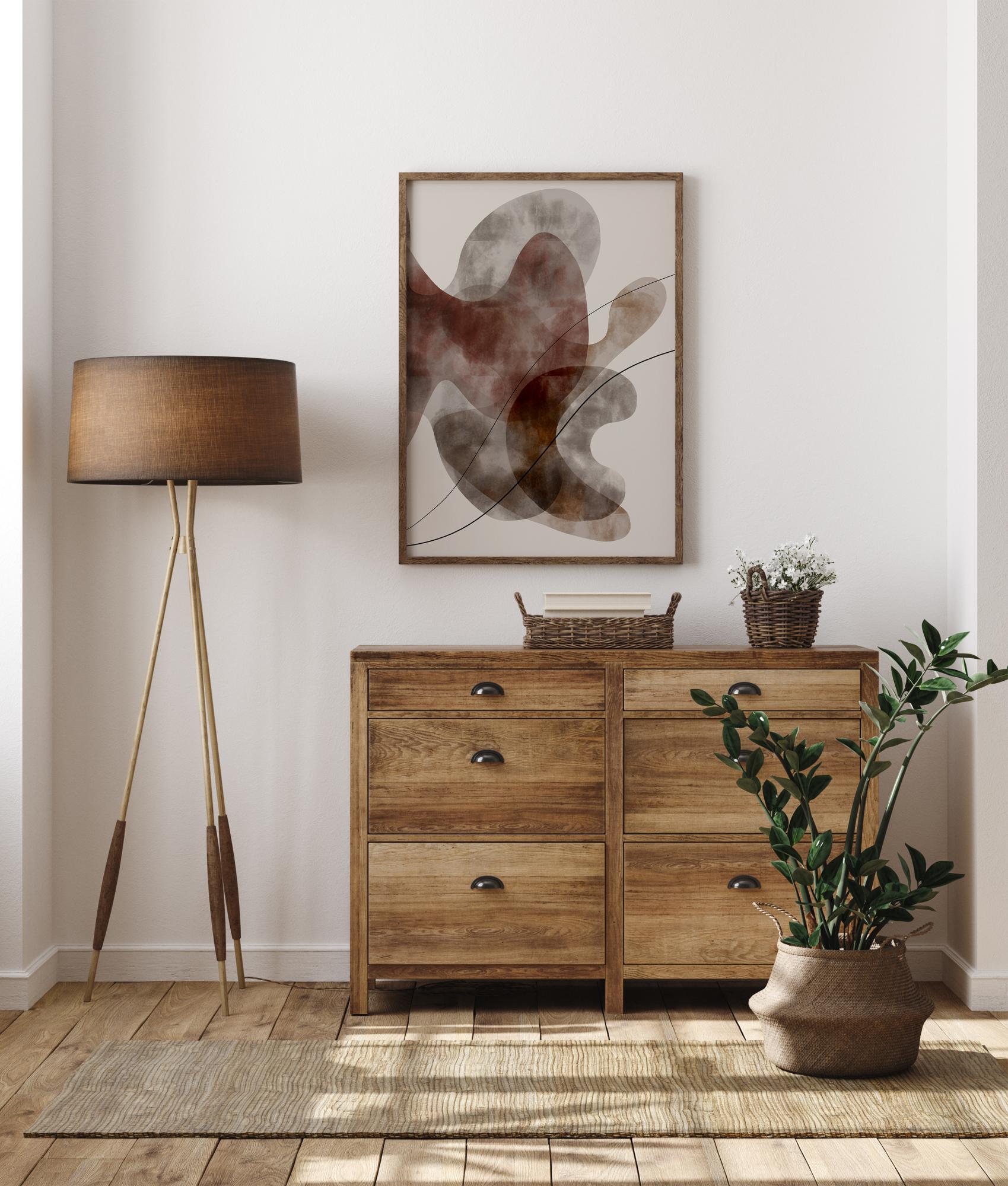 Abstraktní plakát s podivnými tvary v různých barvách připomínajících mořské řasy. Tvary jsou vyplněny měkkými hnědými, šedými, růžovými a zelenými barvami s mlhavým tónem. Dvě linie dramaticky víří nad centrálními tvary, které jsou umístěny na bílém pozadí. Kombinujte s pozadím v měkkých pastelových barvách pro získání zajímavého tématu k rozhovoru.