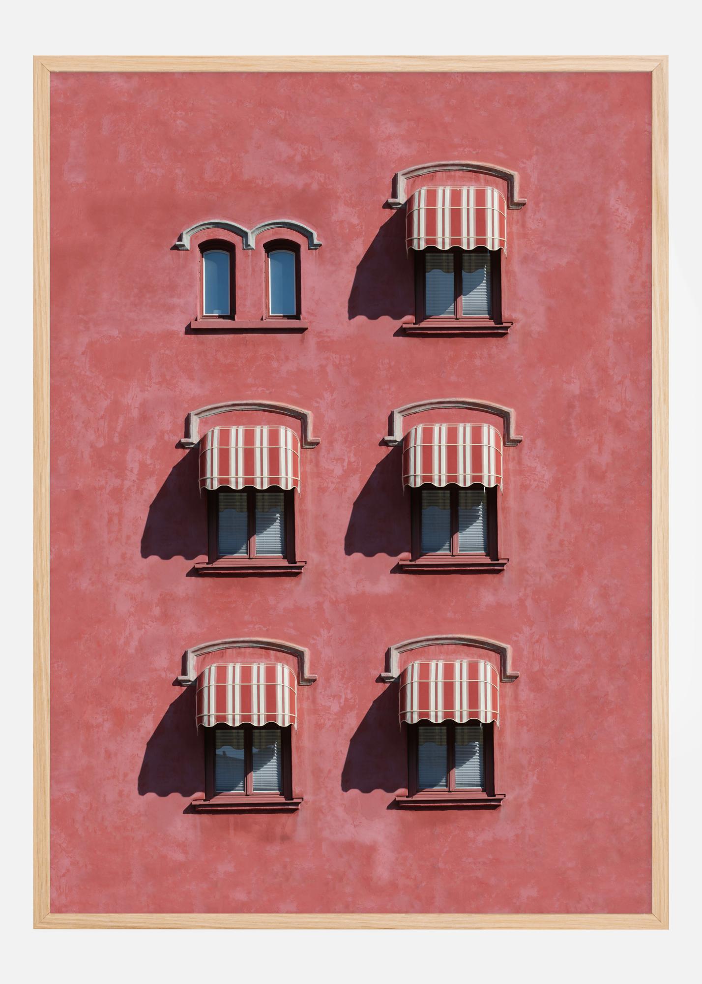 Tento elegantní a sofistikovaný plakát, "Red Wall", je ukázkou architektonické harmonie a vizuální rovnováhy. Šest oken, každé s odlišnou markýzou, zdobí živou červenou fasádu a poskytuje rytmickou symetrii, která je uklidňující a uspokojivá pro oko. Hravý tanec slunce po povrchu oživuje strukturu a vytváří hru mezi světlem a stínem.