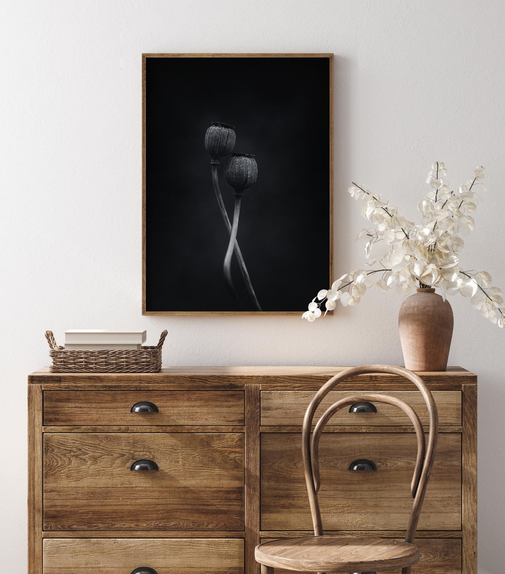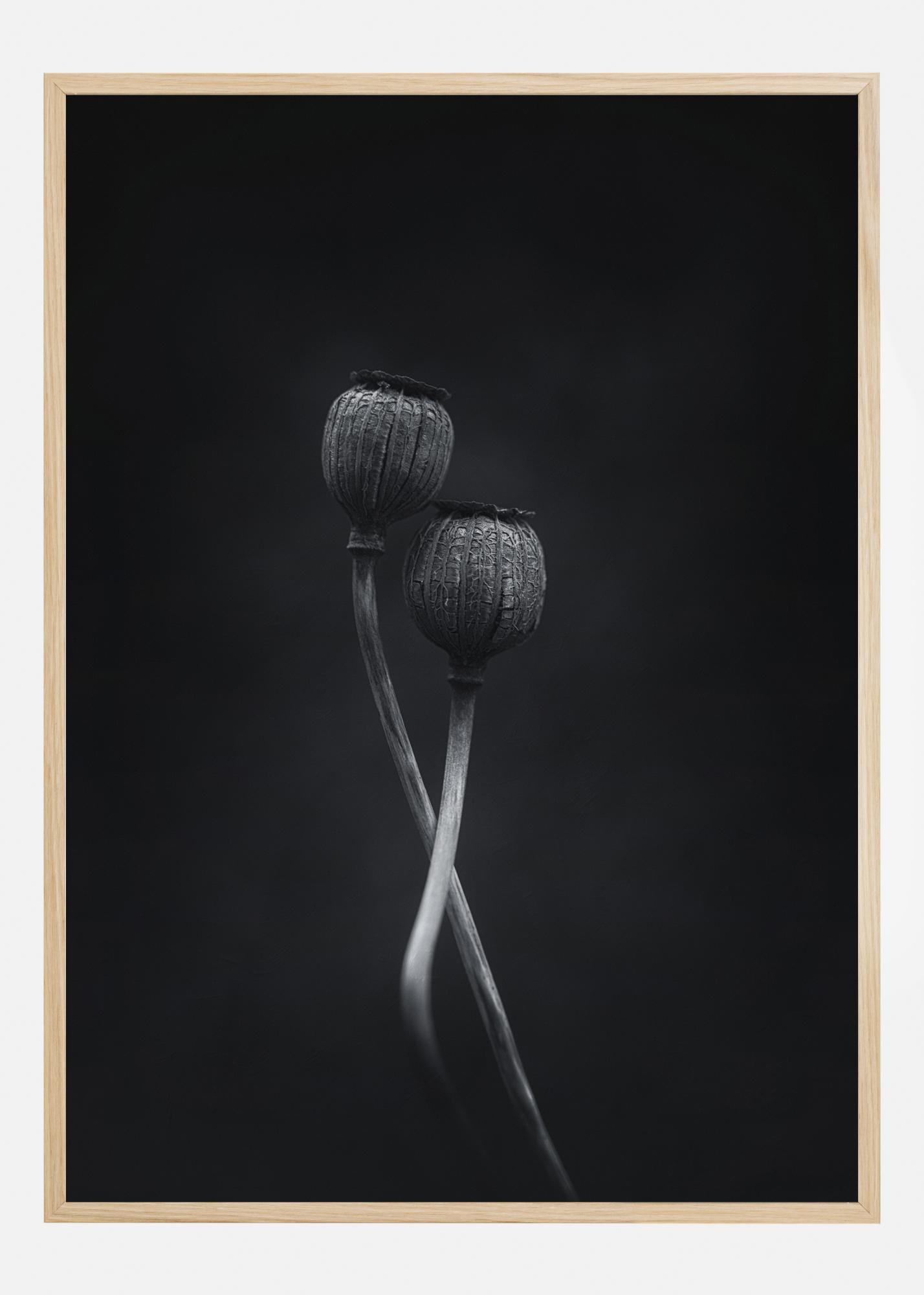 Detailní přírodní plakát se dvěma propletenými makovicemi. Tato malířská fotografie vyvolává dojem dvou tanečníků. Pociťte lásku a eleganci, když si tento plakát doma pověsíte.
