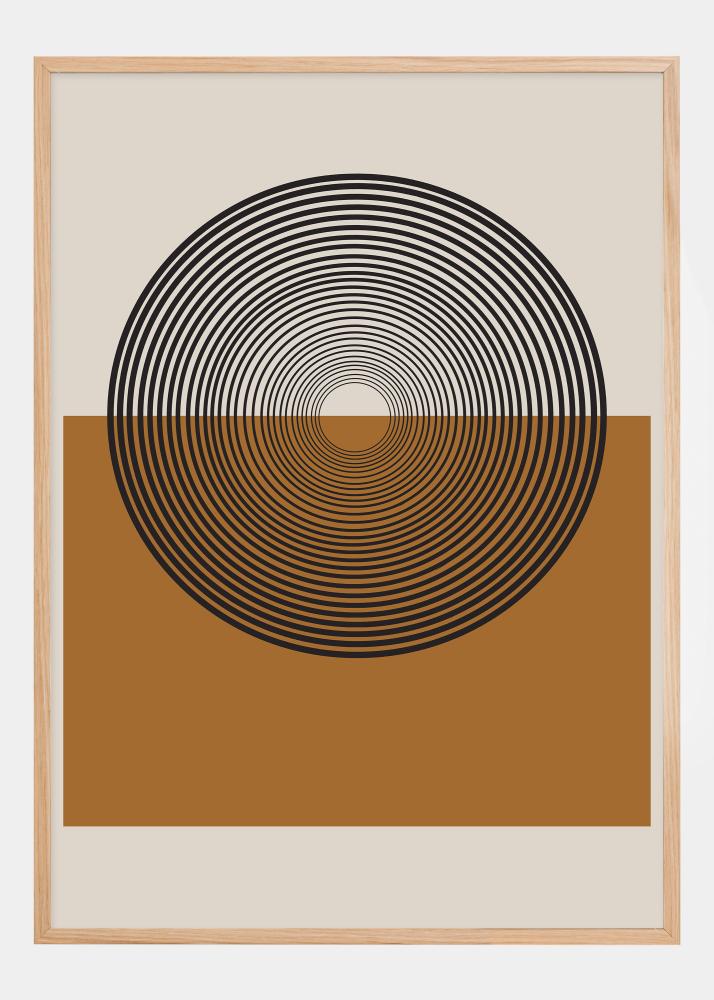 Tento stylový plakát upoutá pohled svým hypnotickým vzorem černých linek, které tvoří vynikající optickou iluzi, umístěnou na bohatém okrovém pozadí, které představuje horizont krajiny. Horní polovina kruhového tvaru vyvolává pocit západu slunce nebo východu měsíce, zatímco vlnící se linie vytvářejí pocit pohybu a hloubky, což dává tomuto uměleckému dílu retro nádech s moderním zvratem.