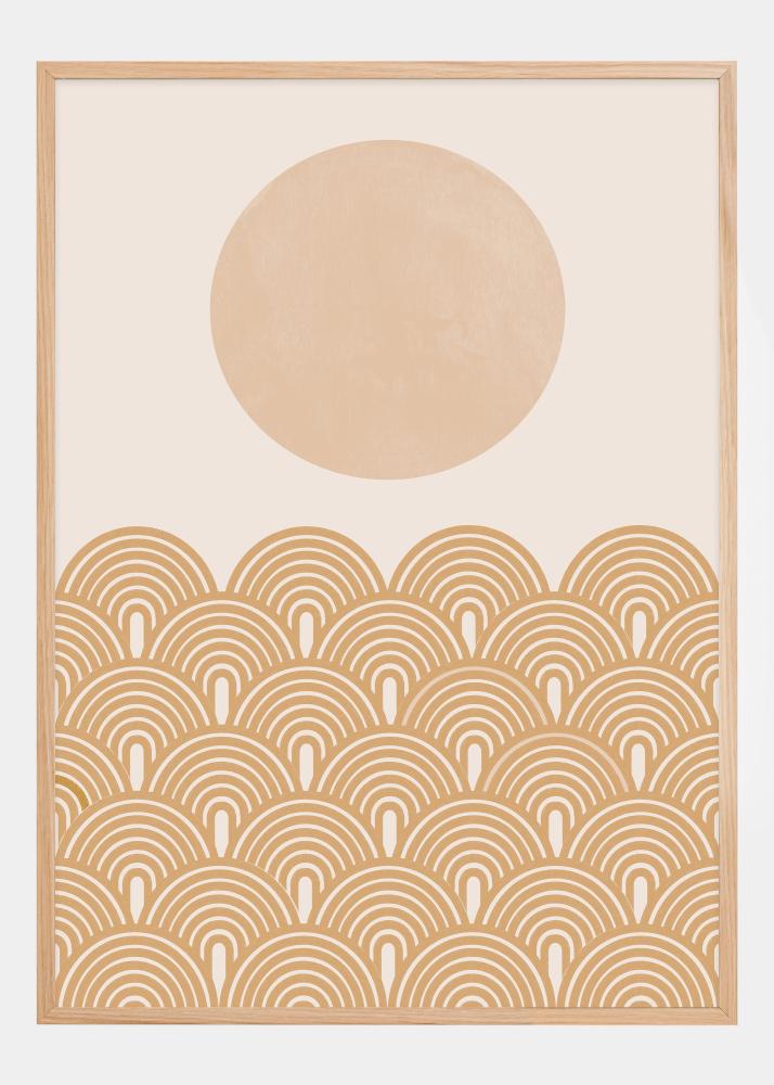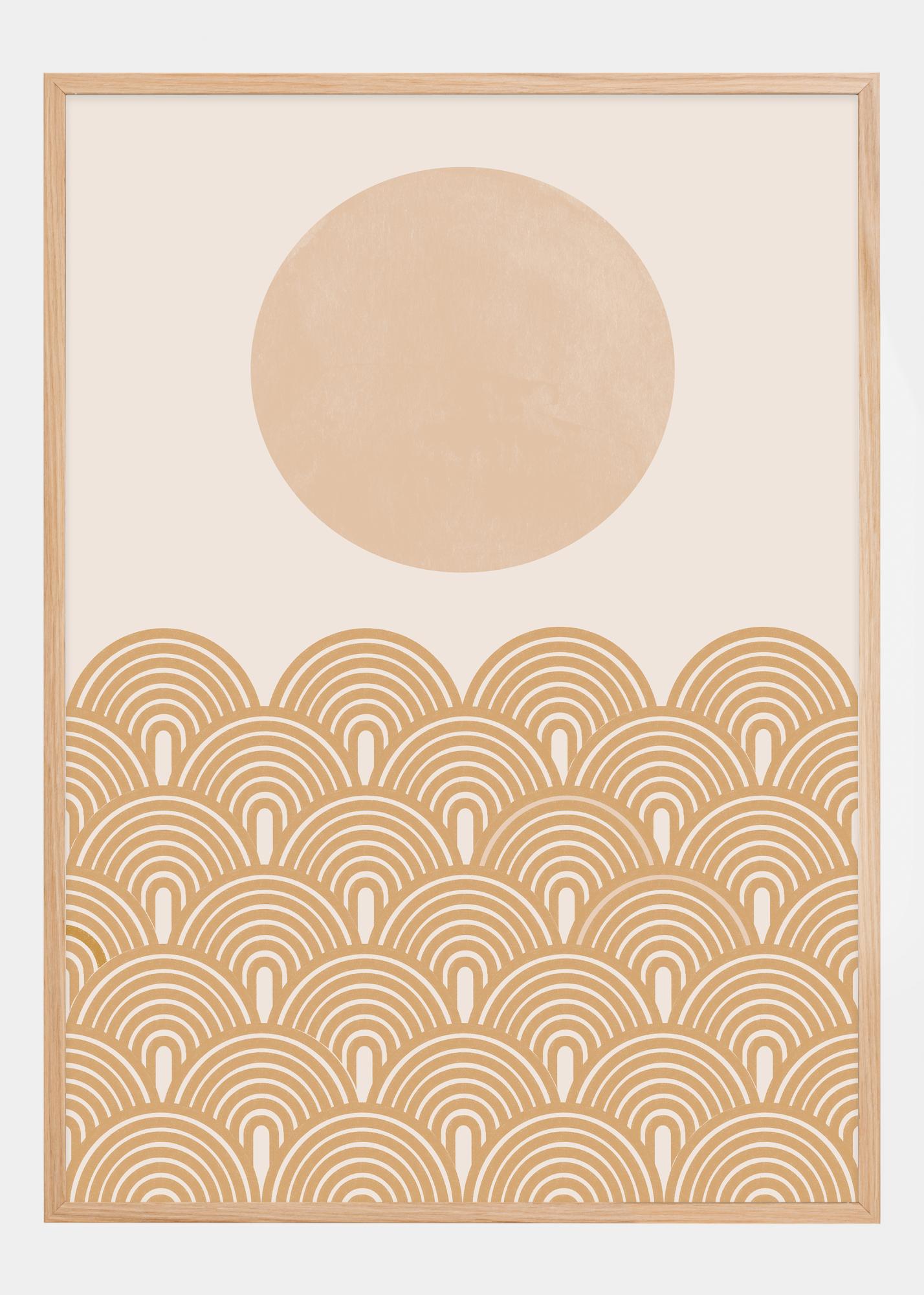 Tento plakát je sluneční interpretací retro stylů a letních vibrací, kde velký bledě růžový kruh se vznáší nad vzorem obloukovitých prvků v teplém terakotovém tónu. Oblouky jsou propojeny způsobem, který připomíná vlny nebo kopce, což přináší pocit pohybu a živosti. Jemné barevné schéma přispívá k pocitu tepla a klidu.