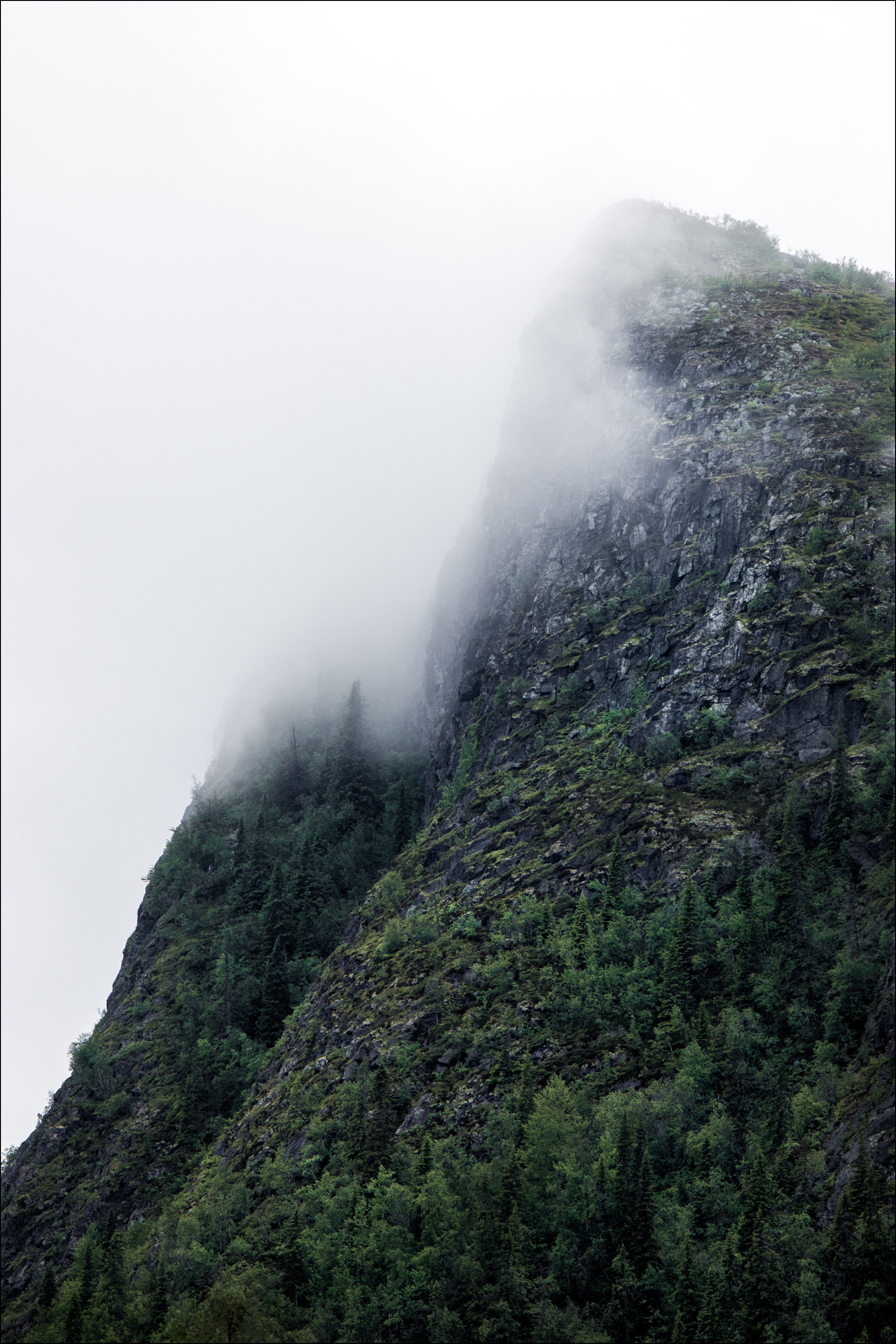 Nádherný plakát s bočním pohledem na horu a stromy. Vrchol hory je částečně zakryt mrakem, což přispívá k vytvoření tajemné atmosféry. Představte si, že šplháte na vrchol, abyste se podívali na výhled, když jej pověsíte ve svém domově.