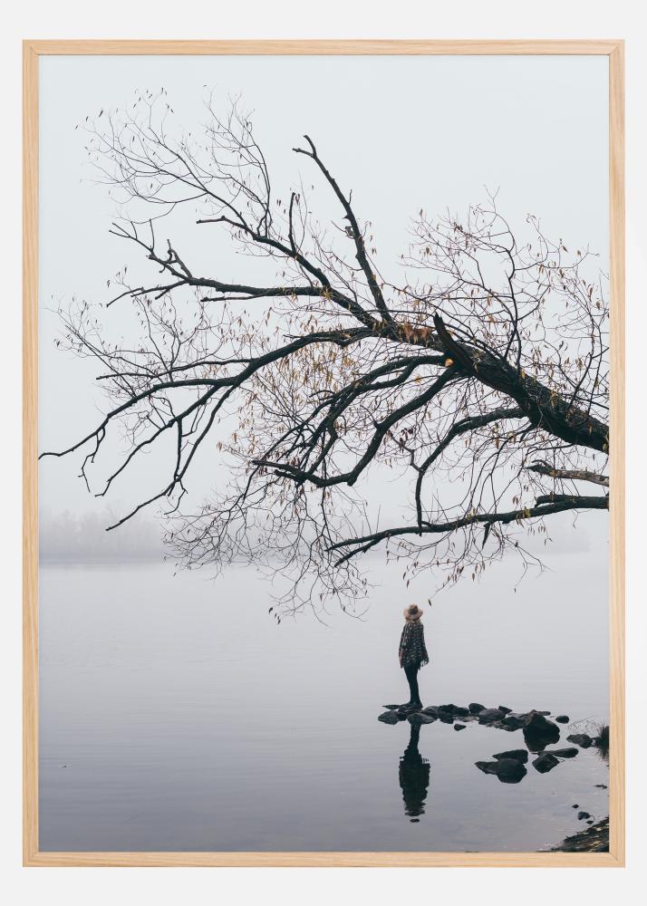 Plakát s výhledem na jezero s ženou stojící na malém kamenném hrázi v jezeře, zatímco nad ní se sklání strom. Bílé jezero ladí s oblohou ve stejné barvě. Žena vyniká v kontrastu, když klidně hledí přes vodu v poklidné kontemplaci. Přineste klid do svého domova s tímto přírodním obrazem.