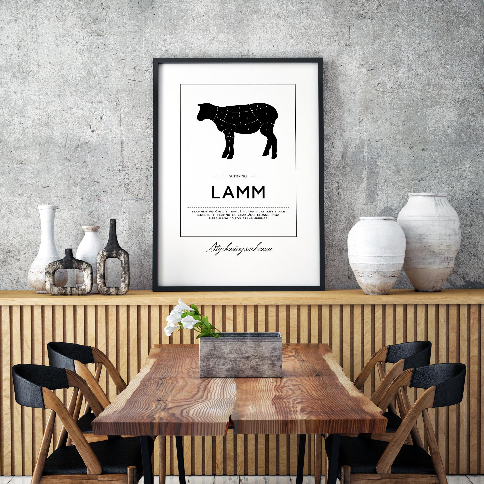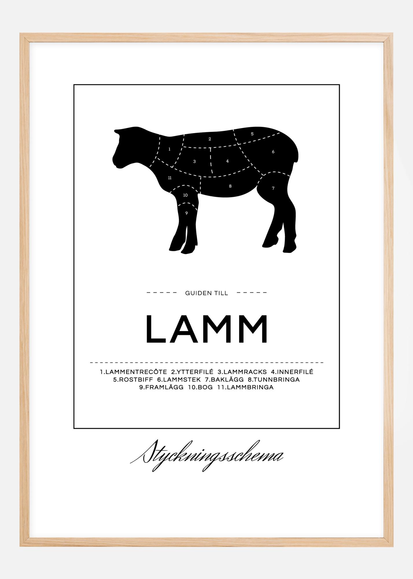 Naučte se, kde najít všechny delikatesy z jehněčího masa s tímto elegantním plakátem na zdi. Plakát zobrazuje černé jehně, které je rozděleno na části, jež ukazují, odkud se například bere svíčková, jehněčí kotlety a plec. Jako doplněk k obrázku je zde text "Průvodce jehněčím" spolu s úhledným očíslovaným seznamem jednotlivých částí. Kolem textu a obrázku běží tenký obdélník a pod ním je natištěn text "Plán řezání".