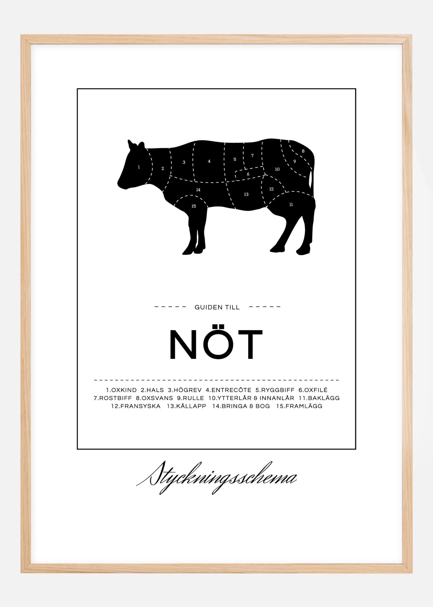 Řeznické schéma není určeno pouze pro profesionální řezníky! Tento stylový plakát zobrazuje černou krávu rozdělenou do úseků, které ukazují, odkud pochází například roastbeef, svíčková a kližka. Pod obrázkem je text "Průvodce hovězím" spolu s úhledným seznamem čísel různých částí. Kolem motivu běží tenký obdélník a pod obdélníkem je nápis s textem "Řeznické schéma". Černobílý design vypadá skvěle s rámem ve stříbrné nebo v barvě podle vašeho výběru. Plakát je k dispozici v několika různých formátech, takže snadno najdete takový, který se hodí právě do vaší kuchyně.