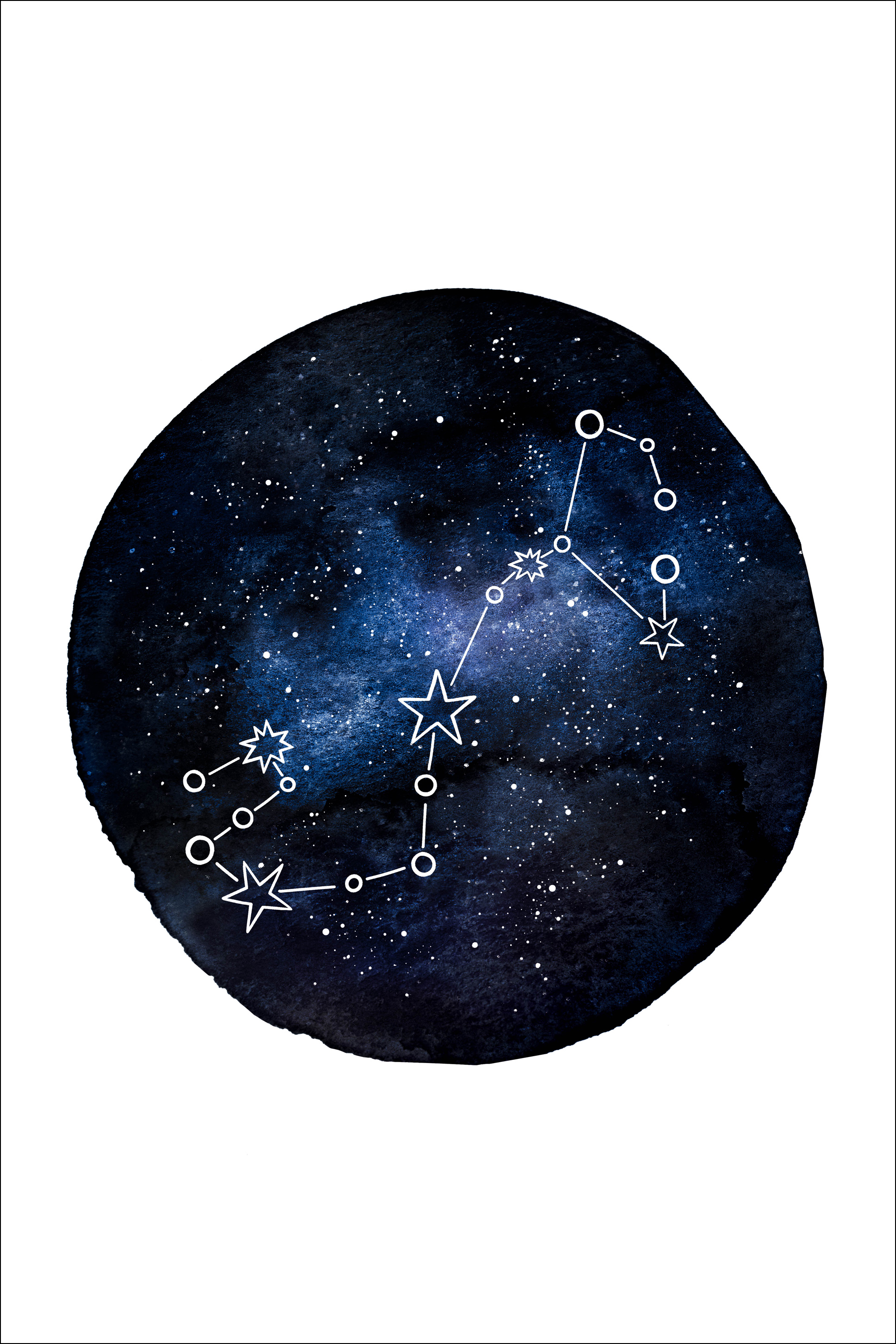Horoskopový plakát se znamením zvěrokruhu Štír. Velký tmavomodrý kruh pluje na bílém pozadí. Uvnitř sféry se nachází galaxie a stovky různých hvězd. Nahoře je znamení zvěrokruhu Štíra. Perfektní doplněk, pokud chcete ukázat své znamení zvěrokruhu.