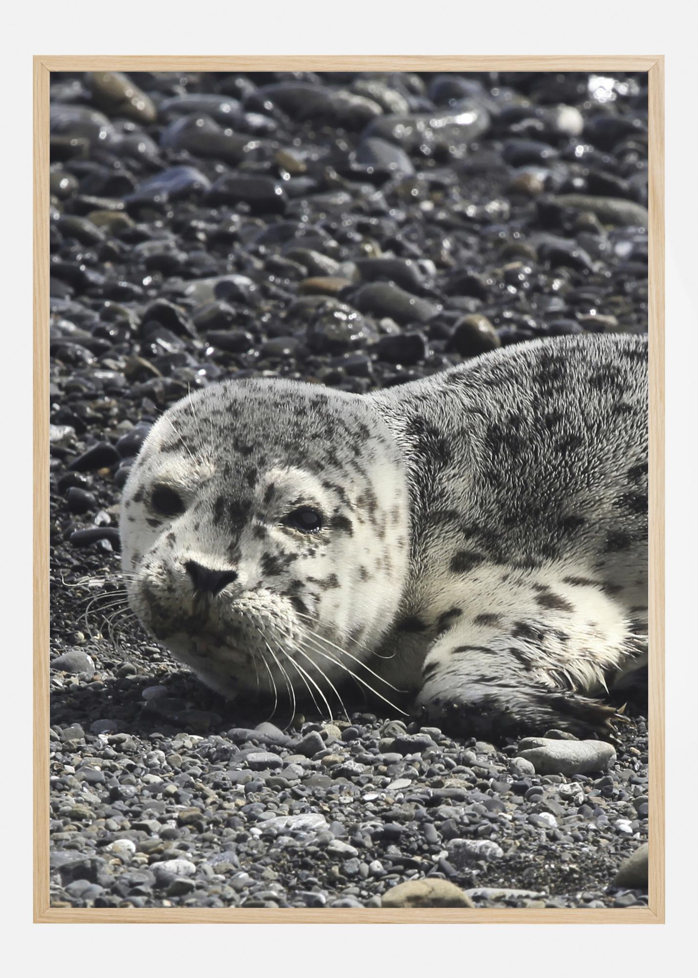 Krásný plakát se zvířetem s tuleněm na skalnatém pobřeží. Šedý tuleň leží na skalách, téměř zcela maskovaný. Skvrny na jeho srsti odrážejí kameny za ním. Ponořte se do soulodních očí tohoto mořského savce, když si přinesete tento obrázek domů.