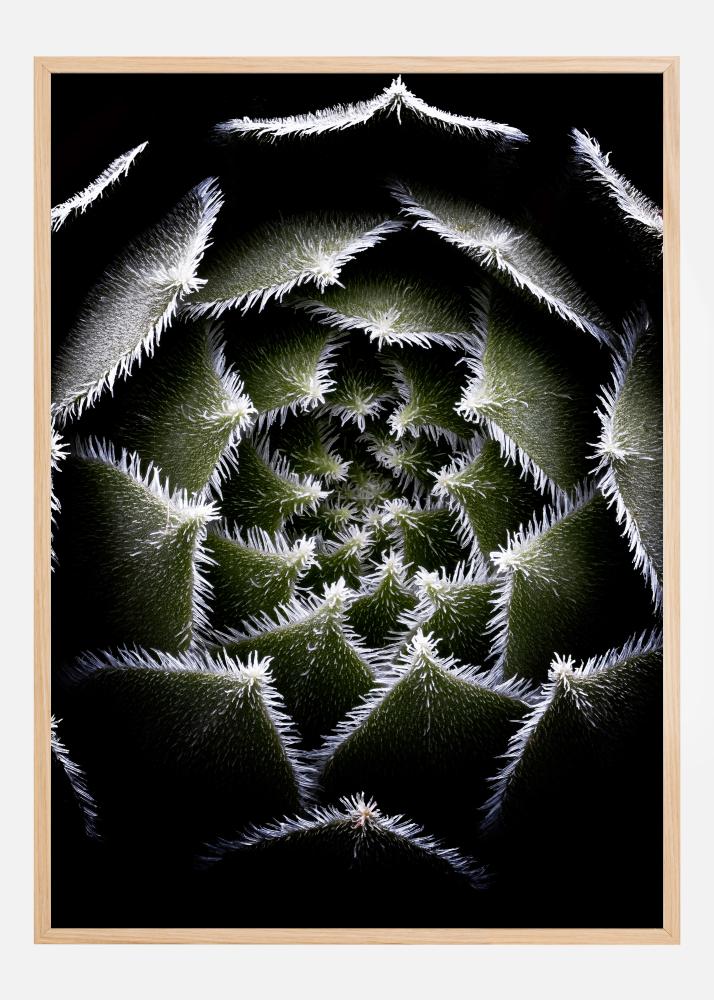 Makrofotografie rozety netřesku. Detailní záběr této rostliny ukazuje rozety hluboce zelených listů, z nichž každý je lemován malými bílými trny. Detaily jsou neuvěřitelné a každý se zastaví u tohoto úžasného plakátu.