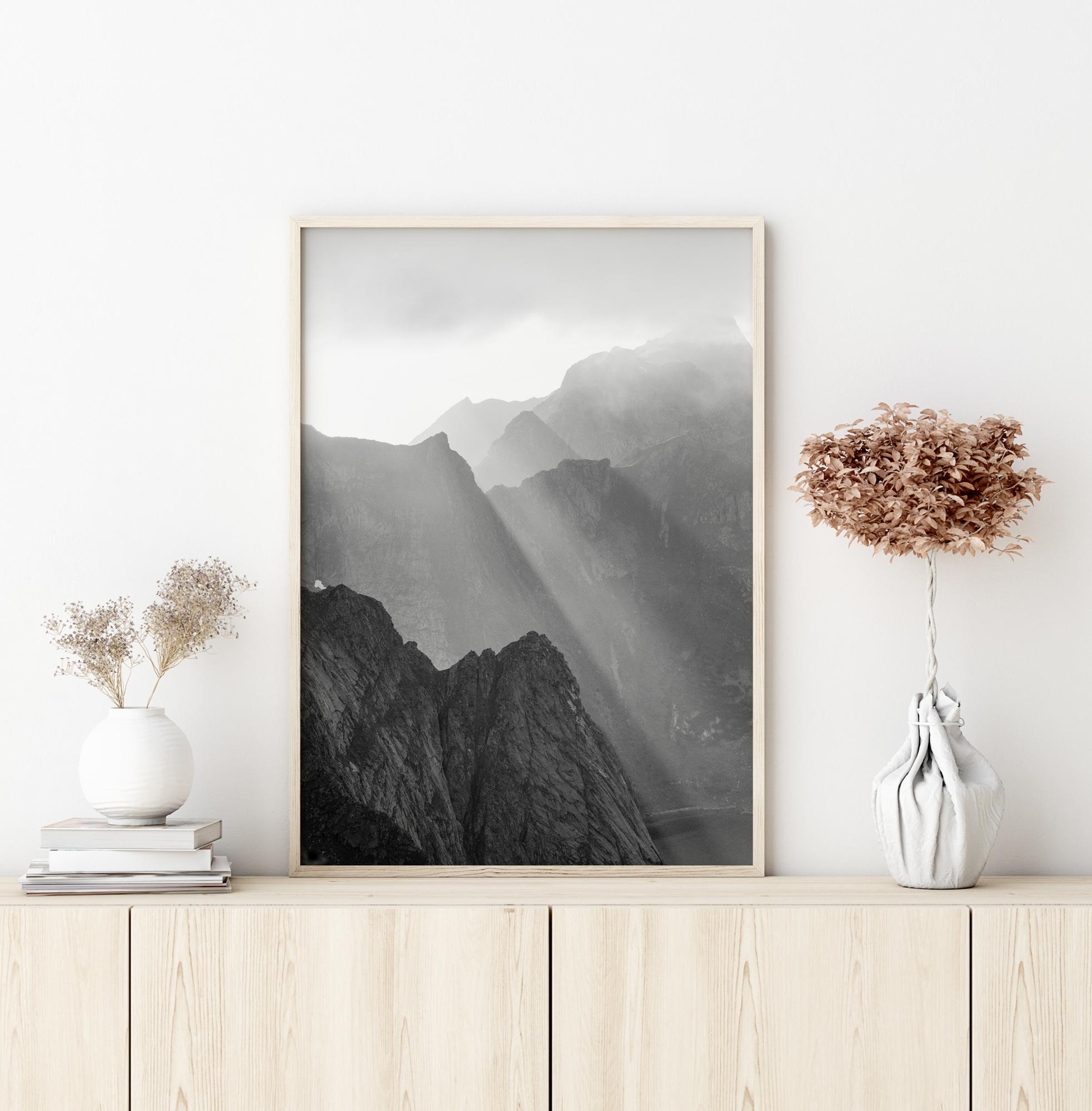Majestátní plakát krajiny, kde silný sluneční paprsek svítí mezi horami. Tmavé, kopcovité tvary horských svahů se tyčí proti jasně bílému nebi, kde září slunce. Přidejte tento úžasný obraz na svou stěnu pro dramatickou, ale přesto magickou scénu.