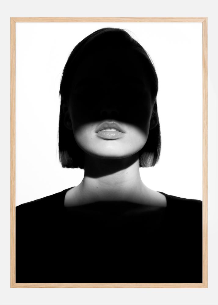 Tento nápadný plakát zachycuje mocný obraz ženy, jejíž oči jsou skryté tmavým stínem, což vytváří tajemný a zamyšlený efekt. Ostrý kontrast mezi bílými vysokými světly a hlubokými černými tóny zdůrazňuje její výrazné rty a sochařské rysy obličeje. Je to obraz, který balancuje na hranici mezi viditelností a anonymitou, světlem a tmou, a láká diváka hledat hlubší významy.