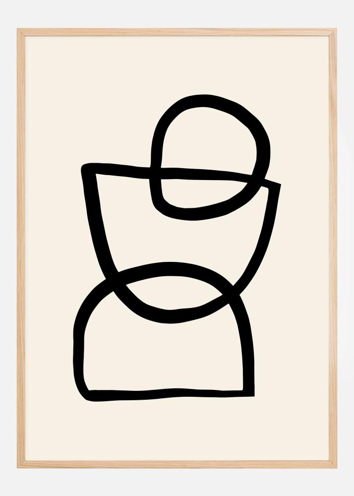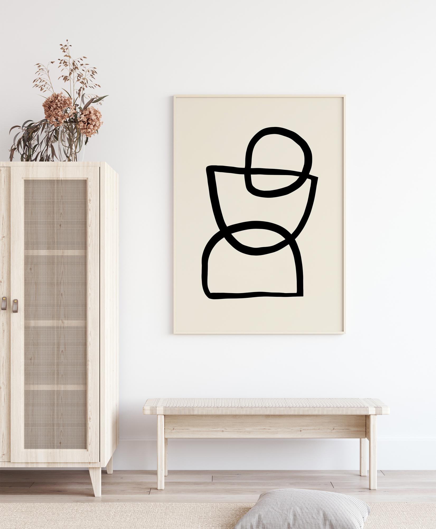 Zábavný abstraktní plakát se třemi různými tvary, z nichž každý je nakreslen silnou černou čarou. Jsou zde dva půlkruhy a jeden plný kruh na horním okraji. Tyto tvary se překrývají a vytvářejí tak abstraktní design. Zavěste si to doma a interpretujte obraz, jak chcete. Je to osoba, stojánek na vejce nebo přesýpací hodiny? To záleží na vás.