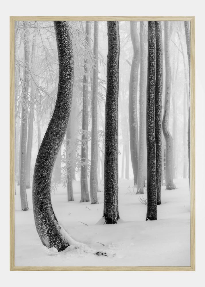 Úžasný přírodní plakát s rostoucími stromy. Tento magický obraz ukazuje tmavé stromy ve sněhem pokrytém lese. Vezměte si tento plakát domů a přeneste zimu do svého domu úžasným způsobem.