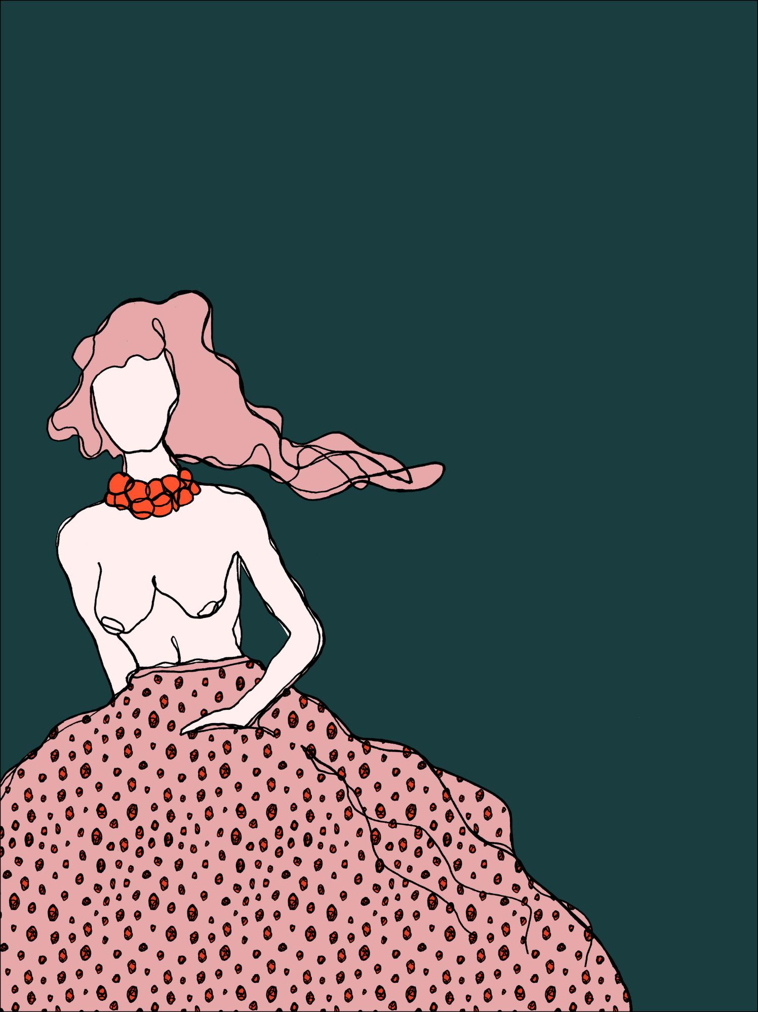 Zábavný plakát s dívkou na zeleném pozadí. Žena je nahoře bez s růžovou sukní s velkými skvrnami, která se vlní ven. Její růžově červené vlasy vlají do stran v neviditelném vánku. Jasně oranžové perly zdobí její krk. S jednou rukou v kapse, tento náčrt ženy v pohybu vyzařuje uvolněný pocit, ideální pro nenuceně chladné zavěšení na zeď.