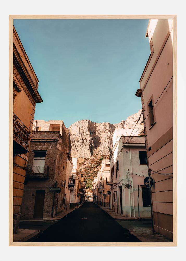 Tento okouzlující plakát zachycuje podstatu malebné ulice ve sicilské vesnici Cinisi s jejími teplými zemními barvami a panoramatem impozantní hory, která se tyčí proti jasně modré obloze. Bledě růžové a žluté tóny budov krásně kontrastují s drsným horským terénem v pozadí a vytvářejí pocit klidu a vyrovnanosti. Tento tisk je poctou sicilskému rustikálnímu kouzlu a jeho schopnosti spojovat přírodu a kulturu do harmonického celku.