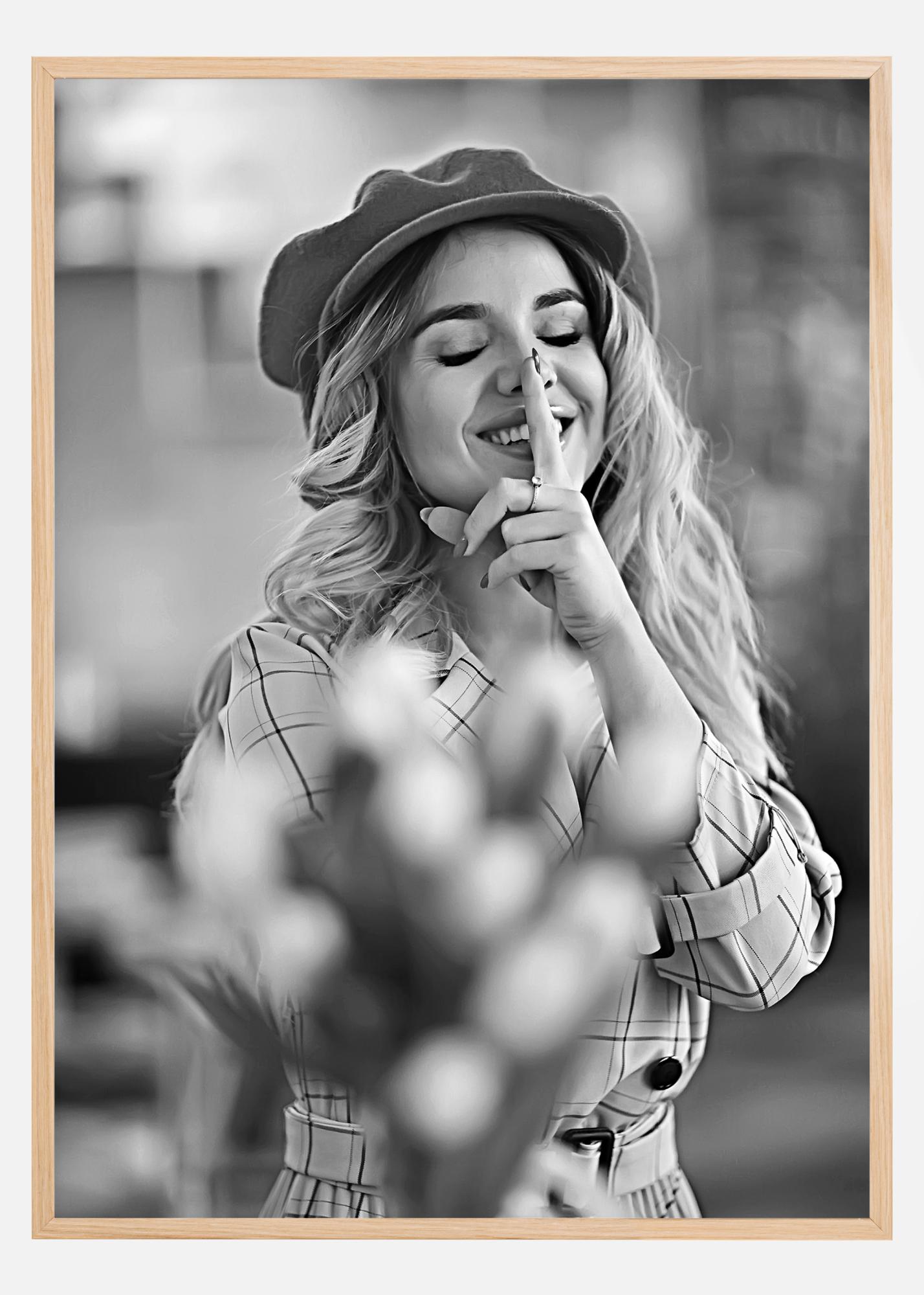 Odvážný portrétní plakát s dívkou s prstem na rtech. Blond vlasy jí padají pod klobouk a tato roztomilá dívka se široce usmívá, když si klade uklidňující prst na rty. Toto černobílé dílo zlepší vaši náladu každý den, když se probudíte a uvidíte to.