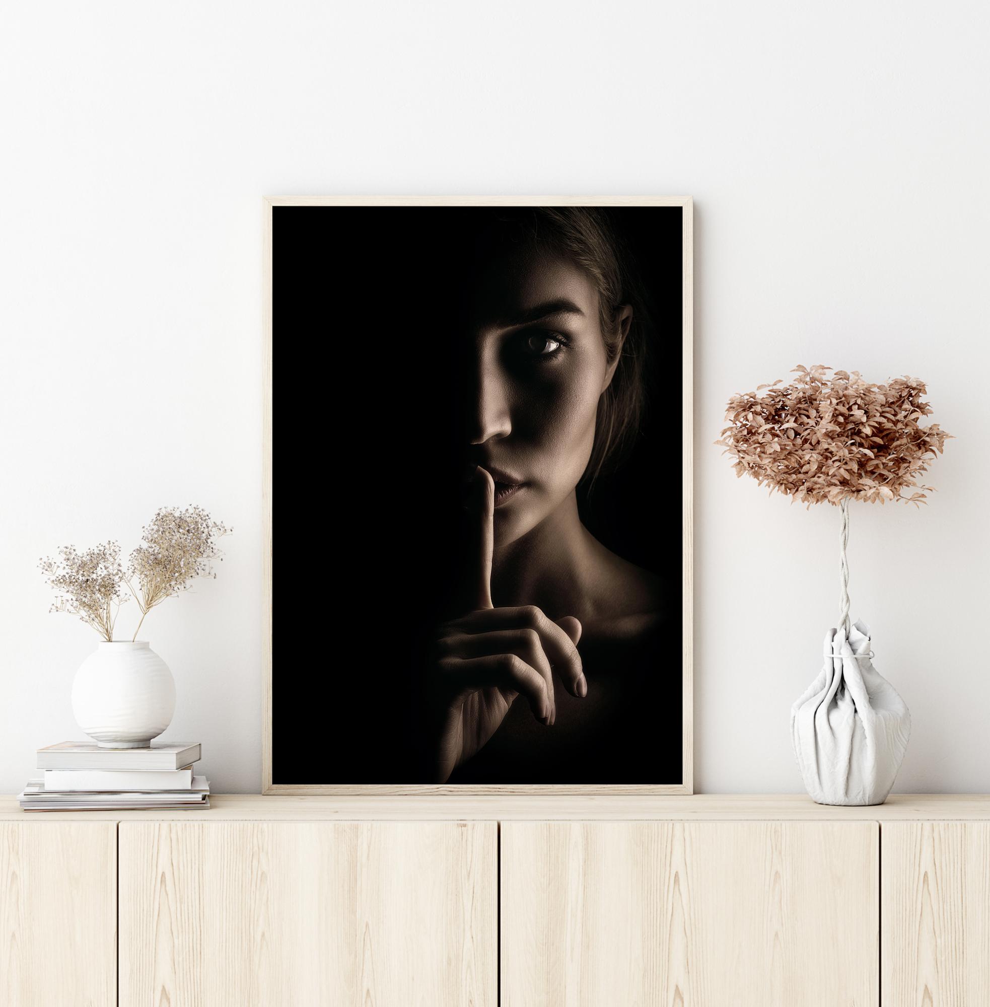 Rádi bychom Vám představili obraz záhadného portrétu, na kterém je tvář ženy zpola ve stínu. Prst je zvednutý ke rtům, aby Vás přiměla k tichu, zatímco přímo hledí do Vašich očí. Dramatické osvětlení vytváří jemnou záři na jedné straně, zatímco na druhé upadá do stínu.