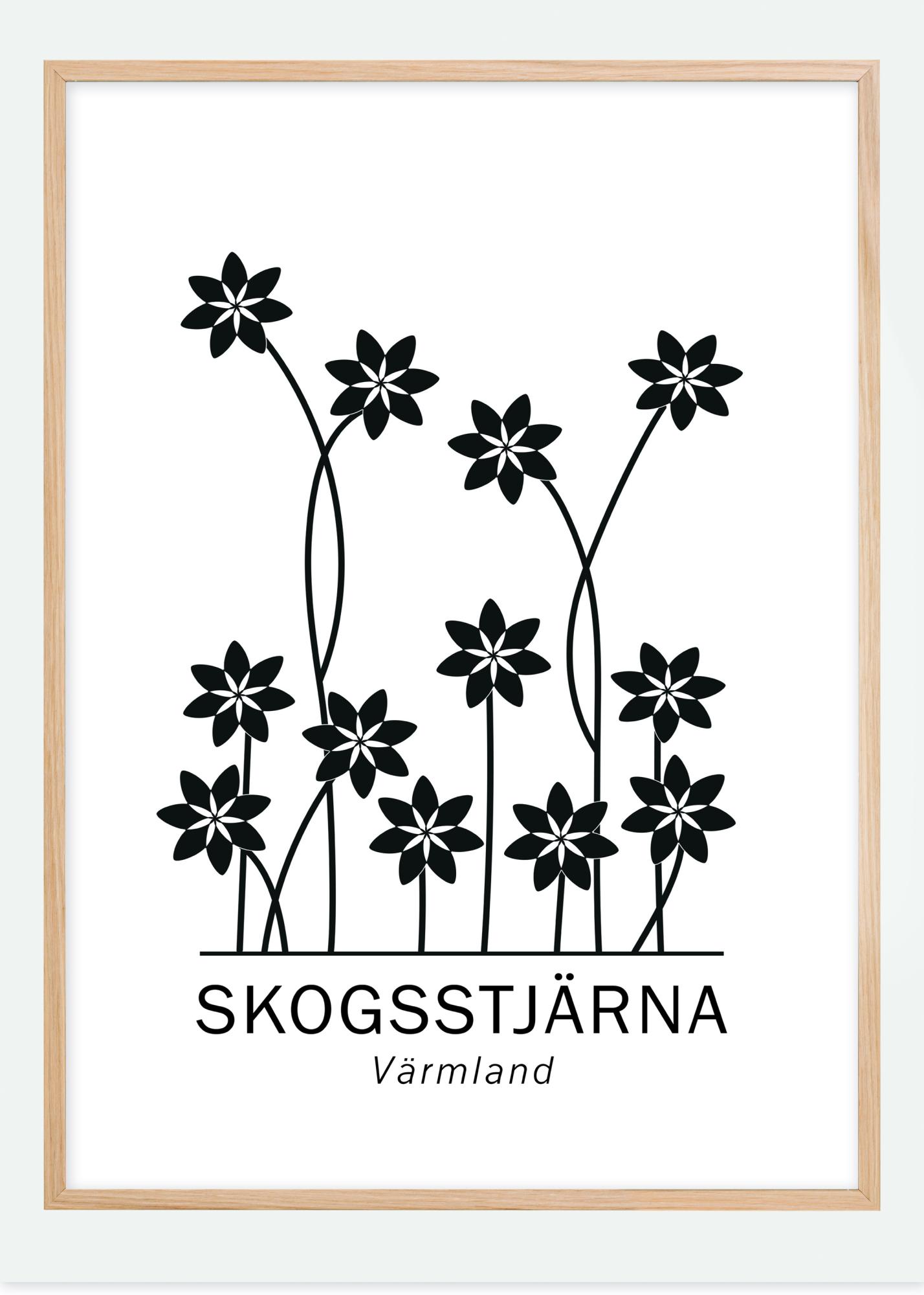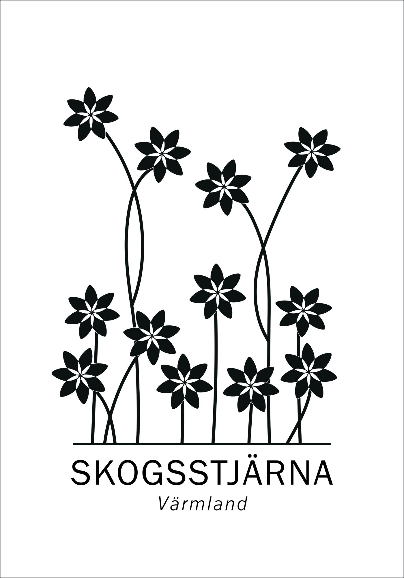 Logotypický plakát s řadou květin v abstraktní tištěné formě. Všechny květiny mají jednotný tvar a jsou černé barvy. Všechny jsou na bílém pozadí s nápisem Skogsstjärna Värmland dole. Zavěste jej, abyste získali zábavný nádech na své stěny doma.