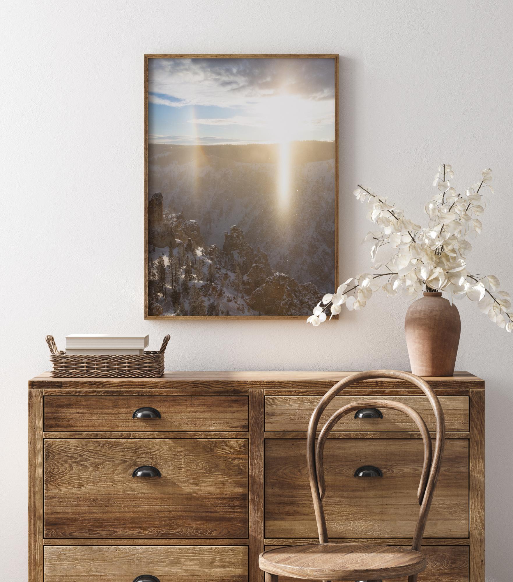 Krásný plakát s zasněženými vrcholy hor. Slunce stojí vysoko na obloze a silně svítí nad horami, čímž vytváří silnou záři s odlesky nad skalami. Mraky se převalují po obloze, když slunce dopadá na zasněžené vrcholy a vytváří dramatický, ale přesto zimní klidný obraz.