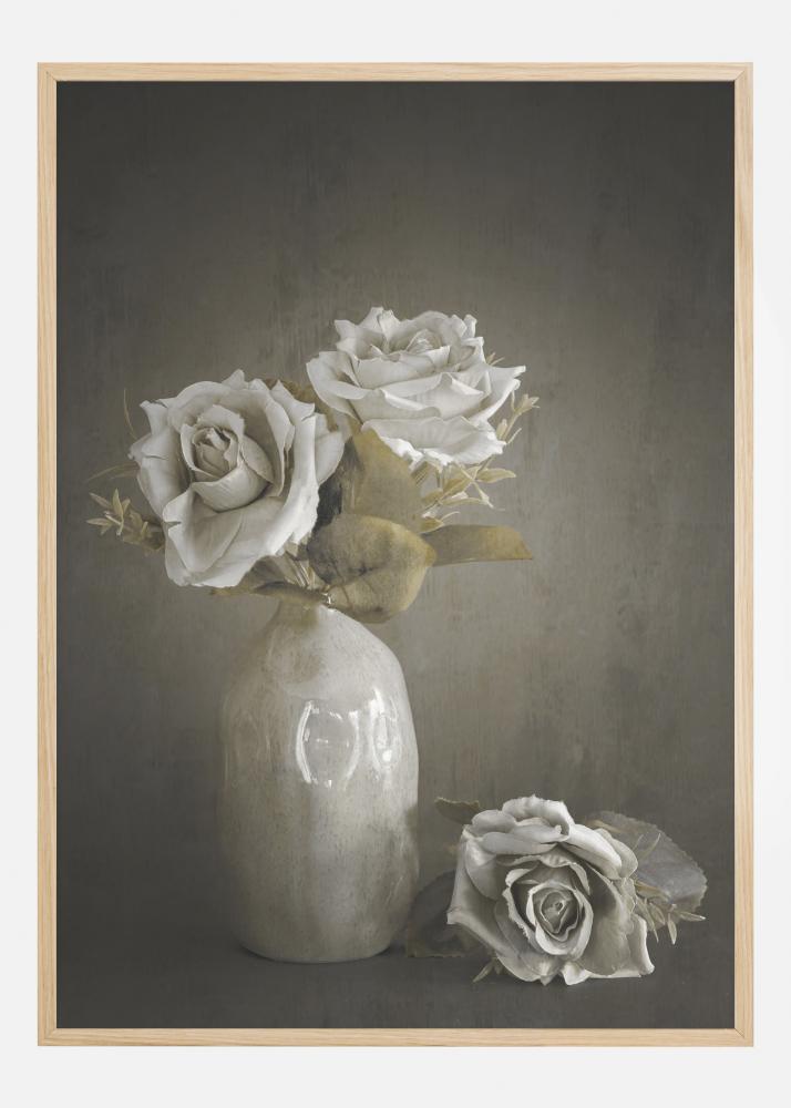 Jednoduchý plakát s malovanými růžemi ve váze. Dvě bílé růže stojí ve bílé váze, třetí růže je umístěna na polici vedle. Každá růže září neviditelným světlem proti měkkému, tmavě šedému pozadí, což vytváří elegantní, ale přesto teatrální obraz.