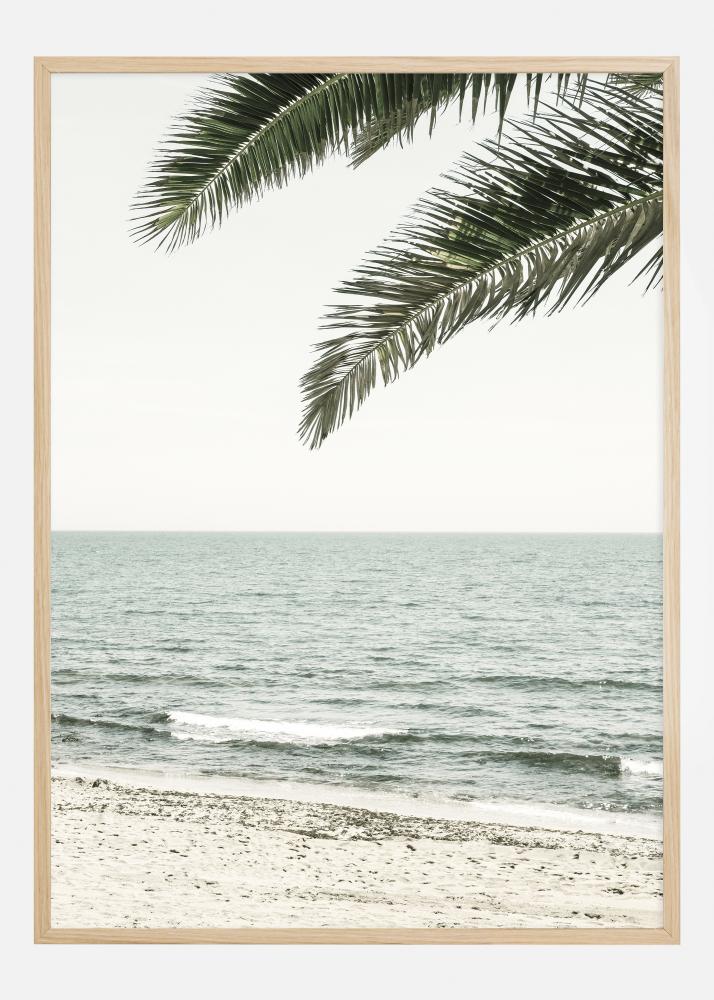 Prožijte klidnou atmosféru tropického útočiště s tímto plakátem, který zachycuje pohled na kymácející se palmové listy proti jasně modré obloze a klidnému moři. Uklidňující plážová scéna je orámována živými zelenými listy, což vytváří přirozený efekt okna a zve pozorovatele snít o teplejších šířkách.