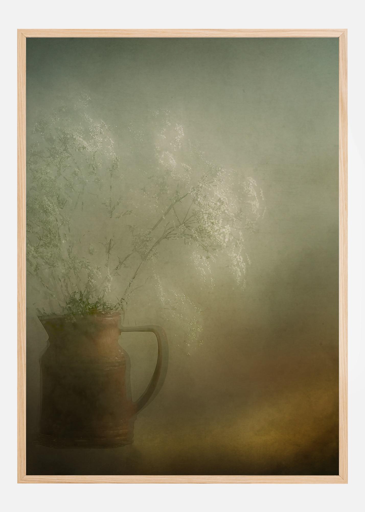 Zátiší jako malba s hnědým hliněným džbánem plným měkkých bílých květů. Tato jarní kytice má oblakovou povahu a téměř splývá s měkkou šedou stěnou za ní. Oranžový svit dodává obrazci teplo u základny, kde stojí džbán.