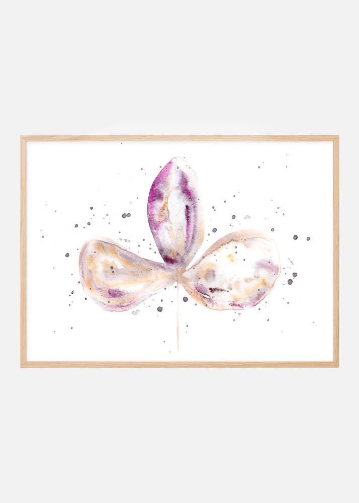 Světle plakát s třemi fialovými okvětními lístky uprostřed bílé pozadí. Různé odstíny fialové vytvářejí tyto měkké rozsáhlé listy. Body fialové barvy se rozšiřují z listů pro abstraktnější pocit. Zvýrazněte barvy pověšením na fialovou stěnu.